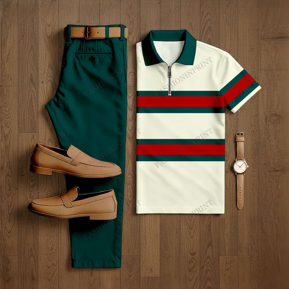 Men's Casual Green & Beige Color Matching Striped Printed Zipper Short Sleeved Polo Shirt & Trousers Two-Piece Set
