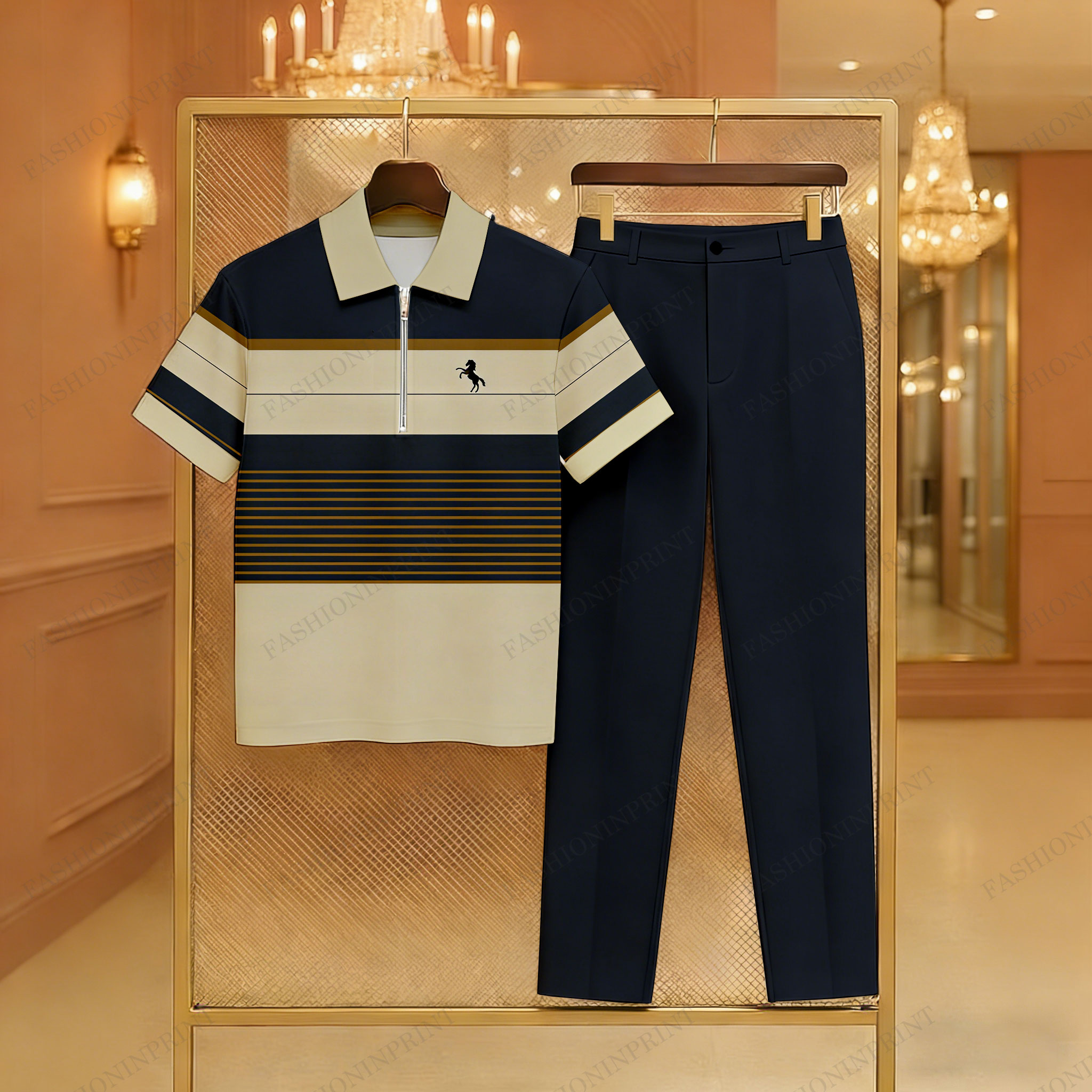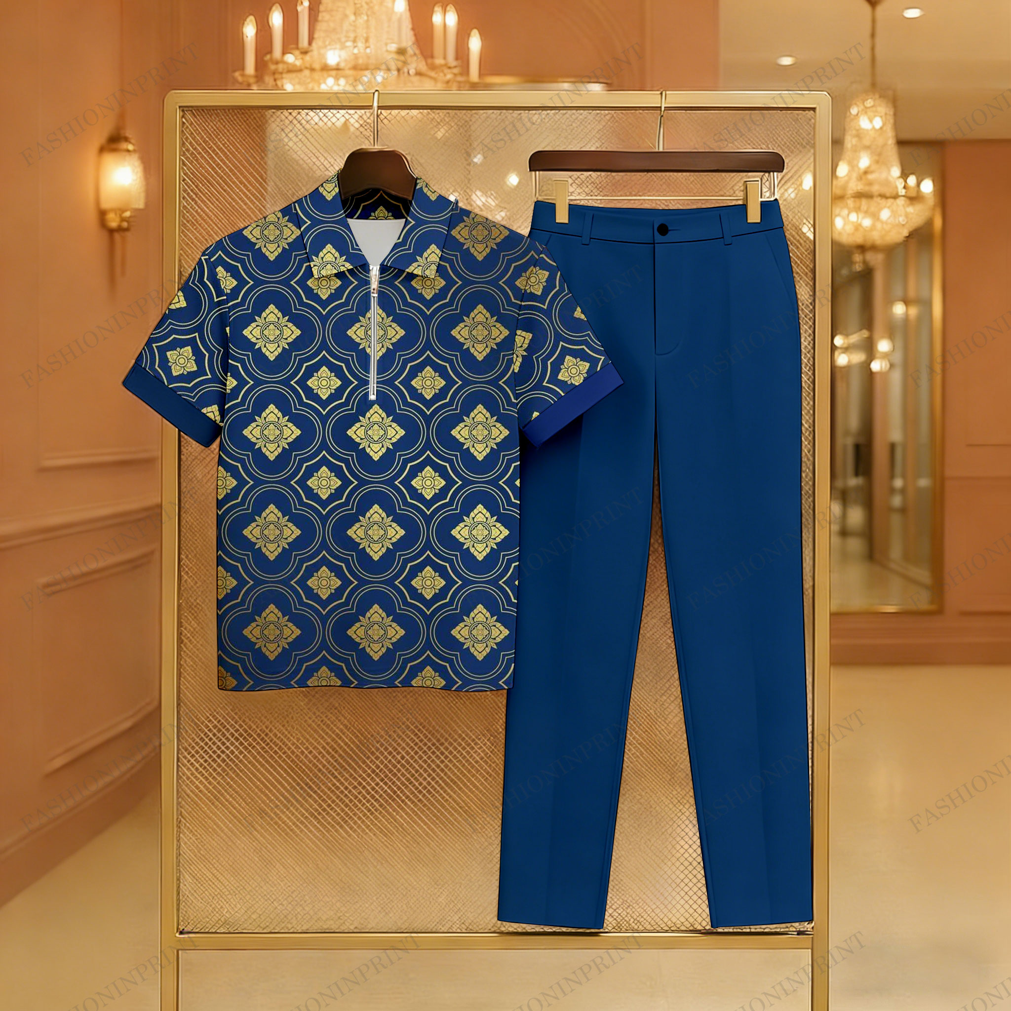Men's Casual Navy Blue Color Matching Retro Style Baroque Printed Zipper Short Sleeved Polo Shirt & Trousers Two-Piece Set