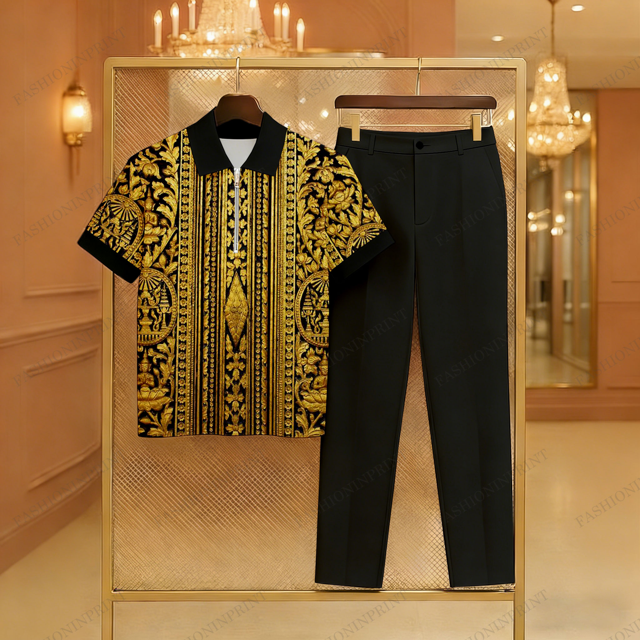 Men's Casual Black & Gold Color Matching Baroque Style Printed Zipper Short Sleeved Polo Shirt & Trousers Two-Piece Set