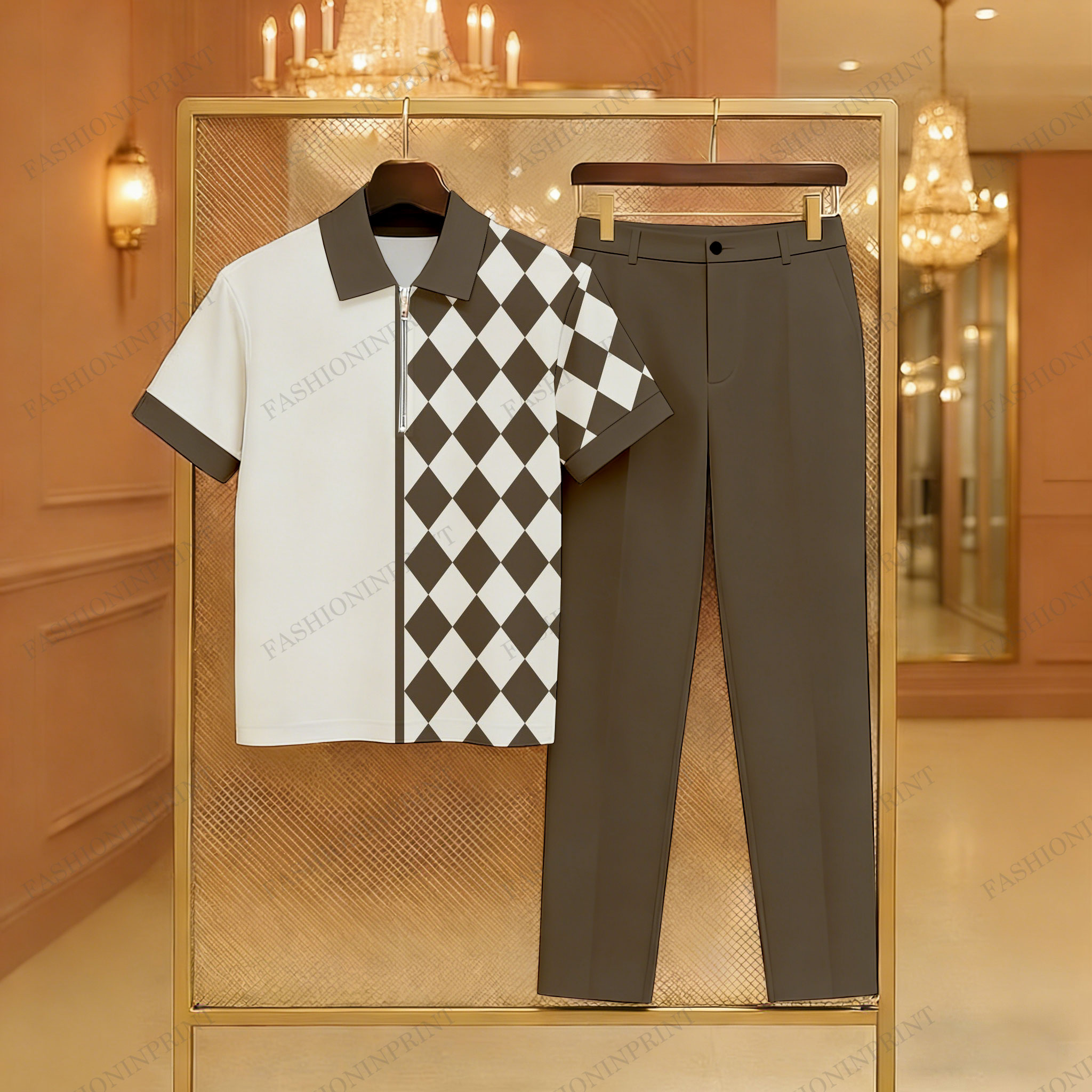 Men's Casual Brown & Beige Color Matching Checkered Printed Zipper Short Sleeved Polo Shirt & Trousers Two-Piece Set