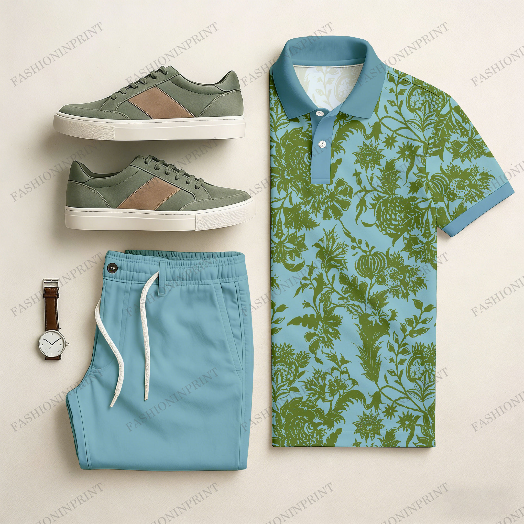Men's Casual Blue & Green Color Matching Floral Printed Short Sleeved Polo Shirt & Trousers Two-Piece Set