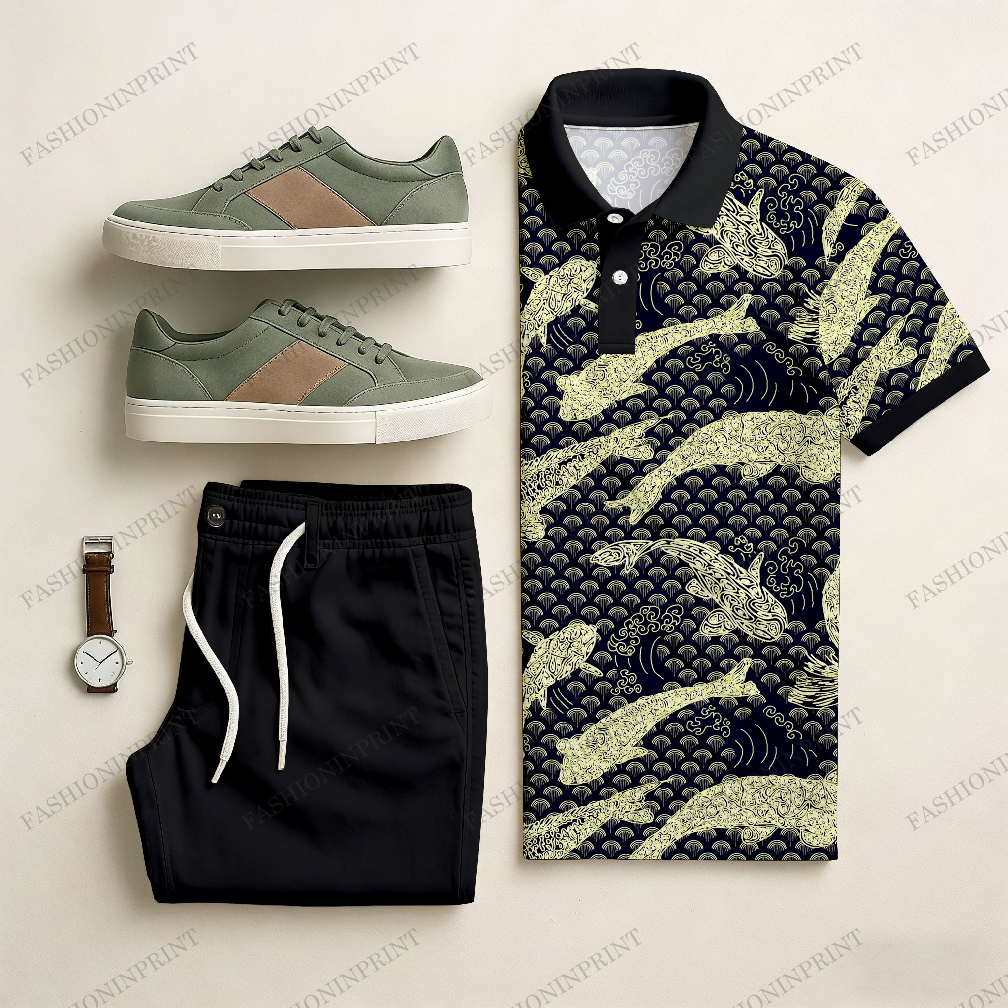 Men's Casual Apricot & Black Color Matching Art Printed Short Sleeved Polo Shirt & Trousers Two-Piece Set