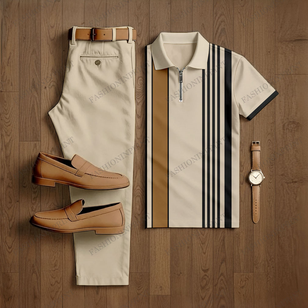 Men's Casual Black & Khaki Color Matching Striped Printed Zipper Short Sleeved Polo Shirt & Trousers Two-Piece Set