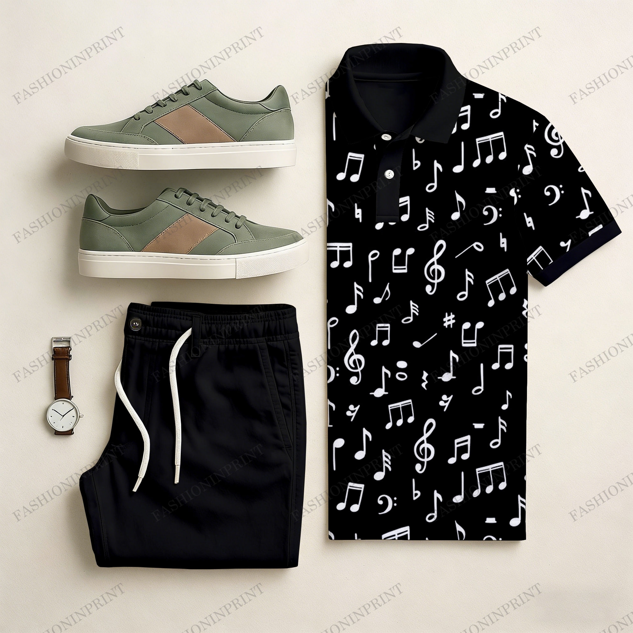 Men's Casual Black & White Color Matching Music Art Printed Short Sleeved Polo Shirt & Trousers Two-Piece Set