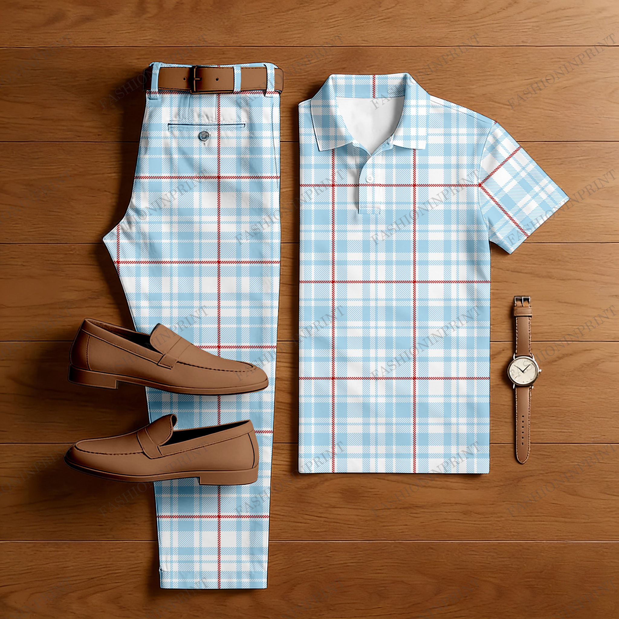 Men's Casual Blue & White Color Matching Checkered Printed Short Sleeved Polo Shirt & Trousers Two-Piece Set