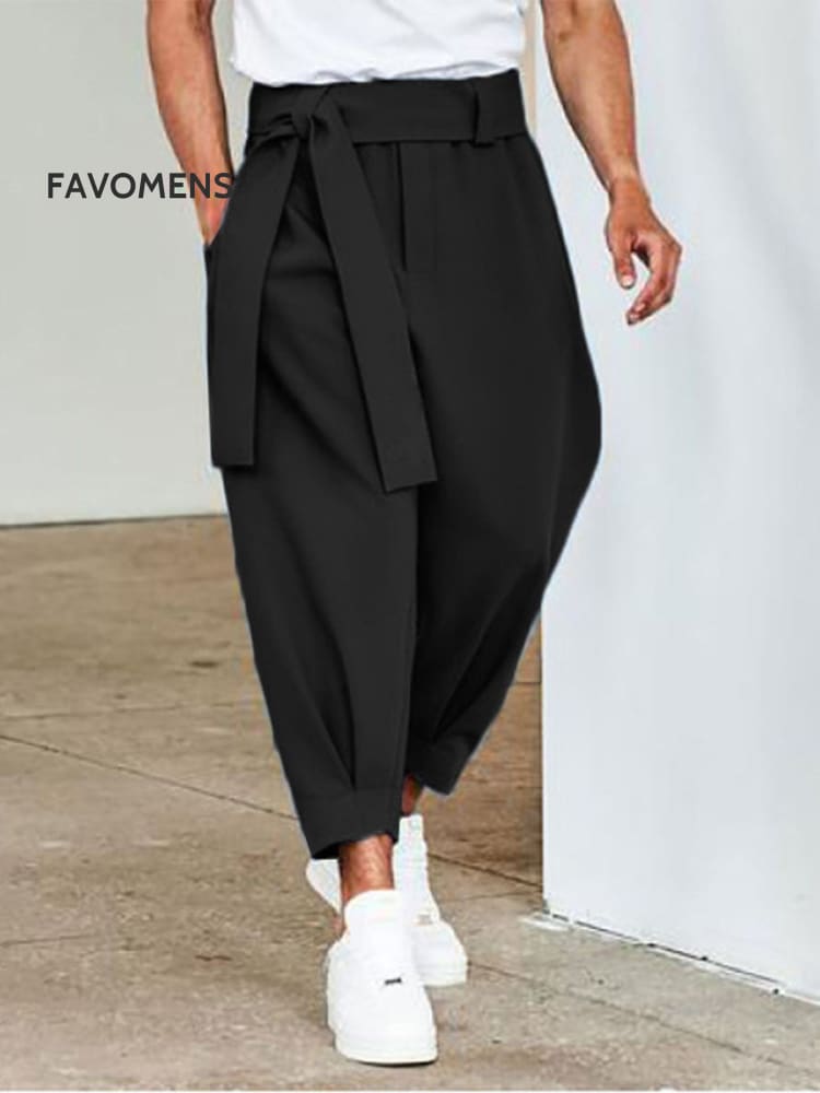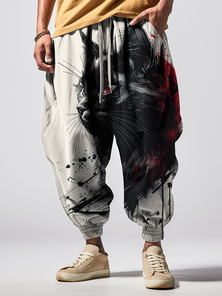 Men's Black Cat Ink Painting Japanese Art Print Loose Drawstring Waist Sweatpants