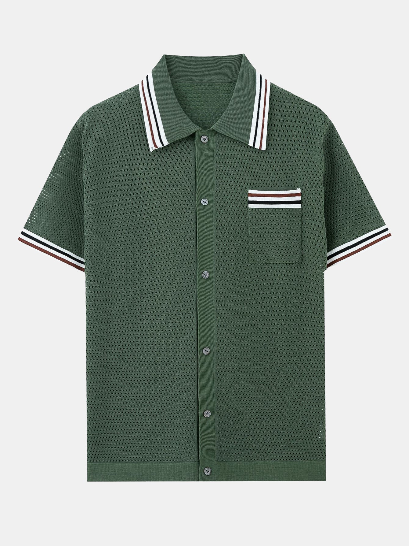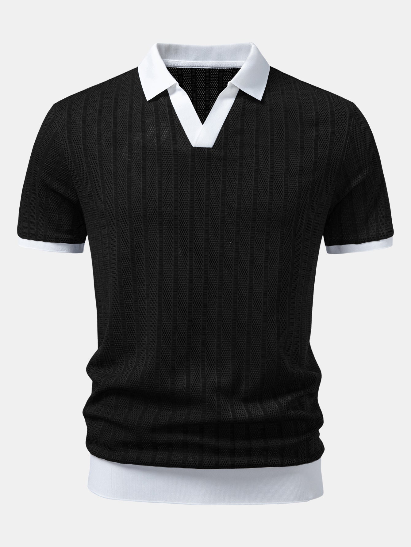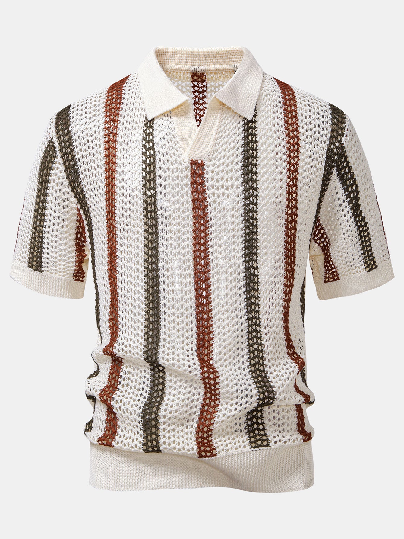 Striped Textured Johnny Collar Open Knit Polo