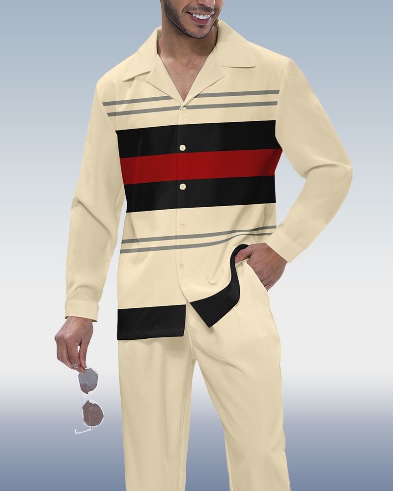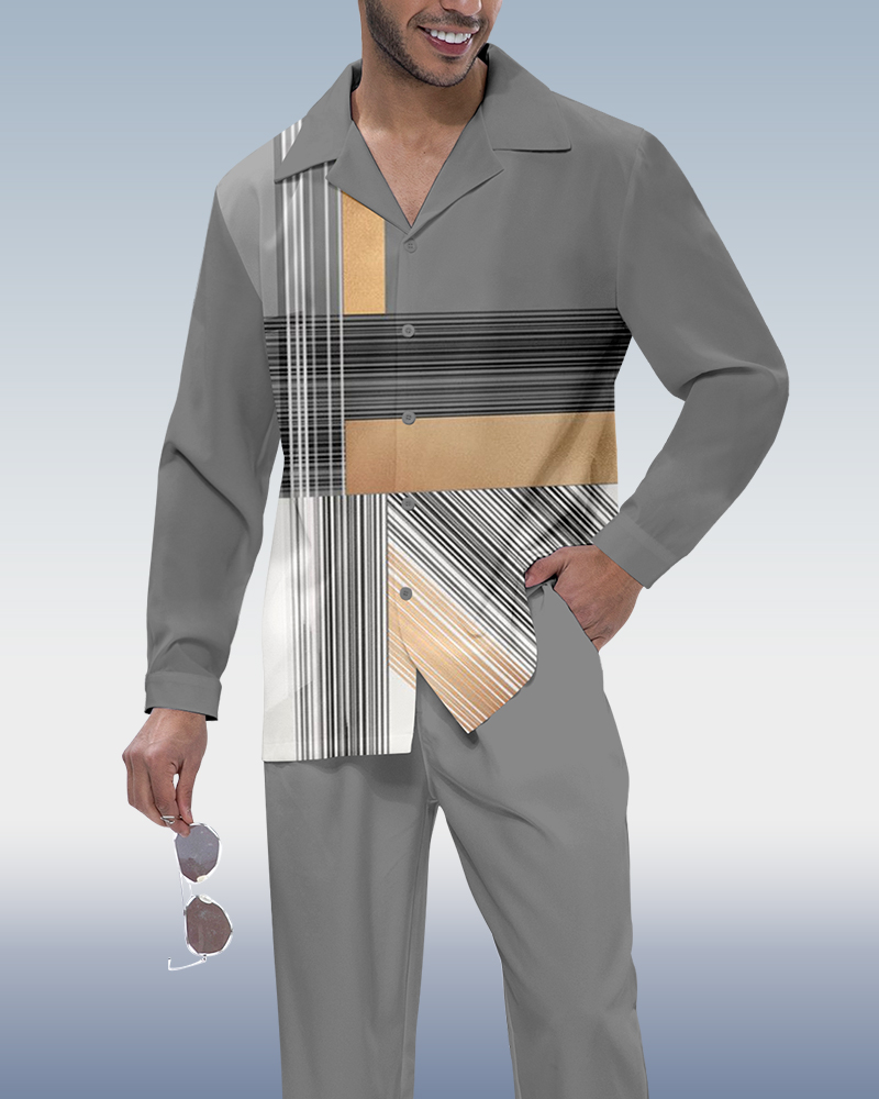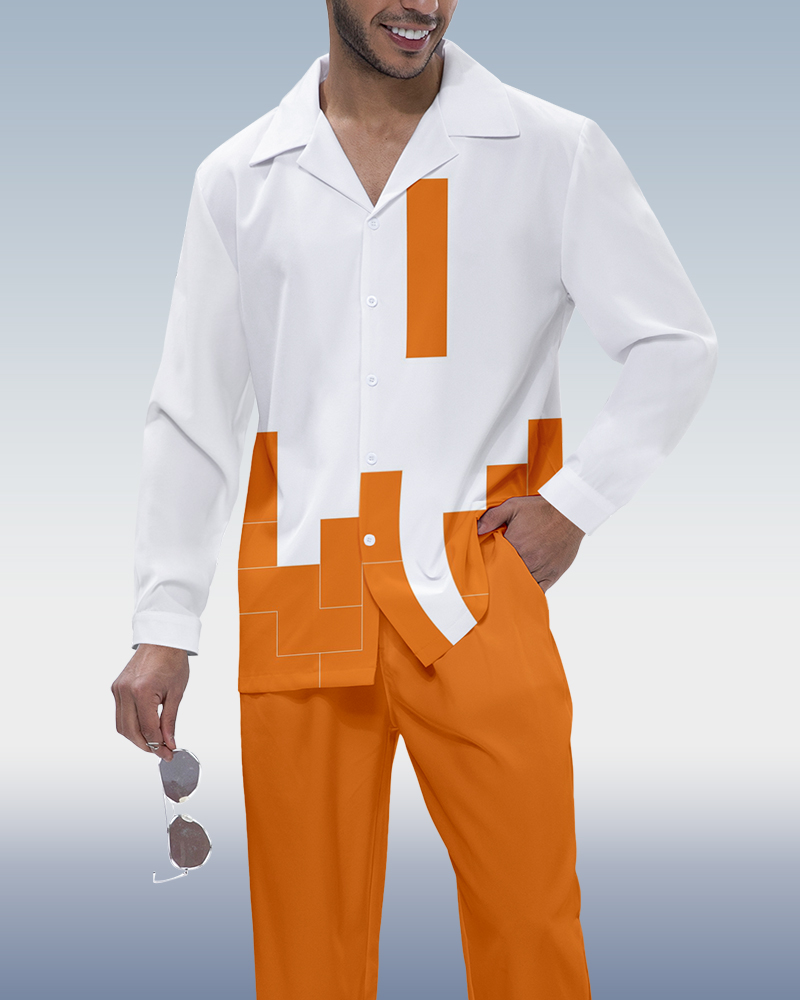 Men's Vintage Colorblock Print Long Sleeve Shirt Walking Set