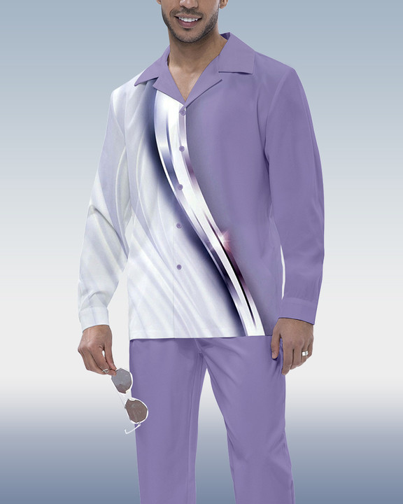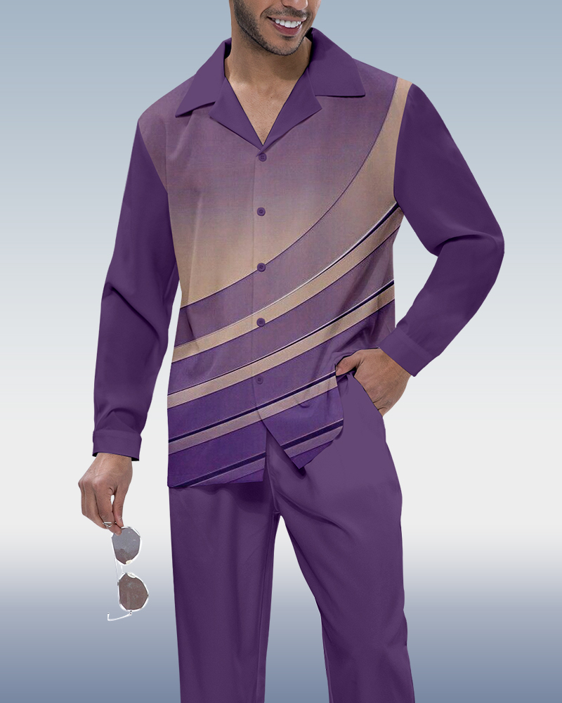 Men's Purple Stripe Printed Long Sleeve Shirt Walking Suit 42
