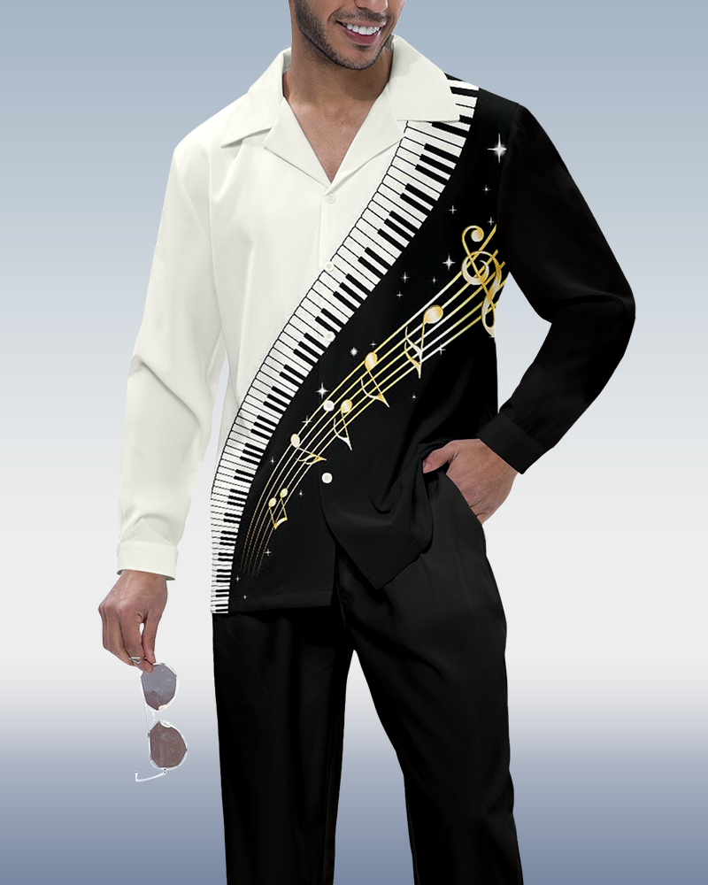 Men's Vintage Color Block Piano Print Long Sleeve Shirt Walking Set 5