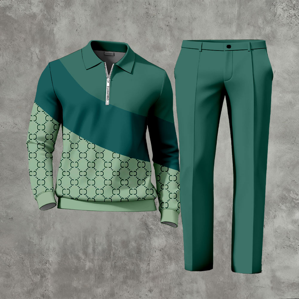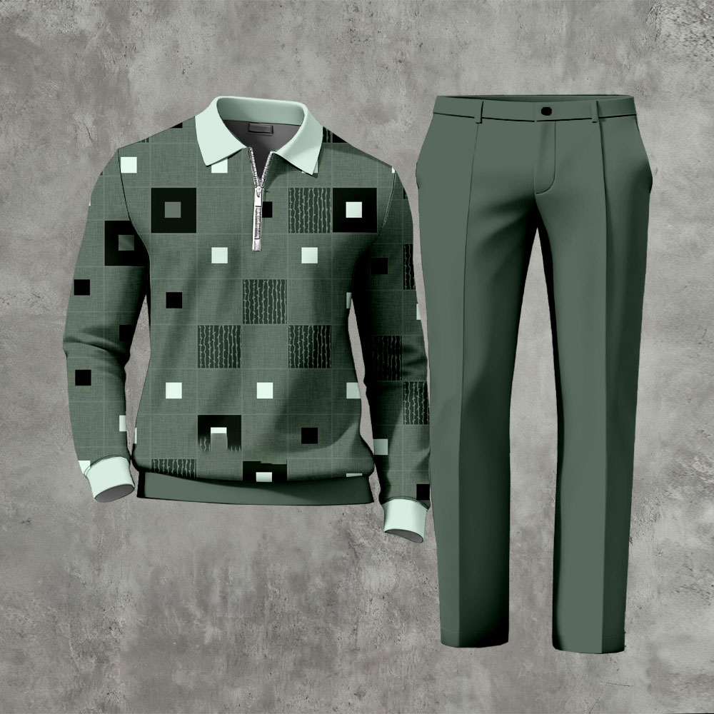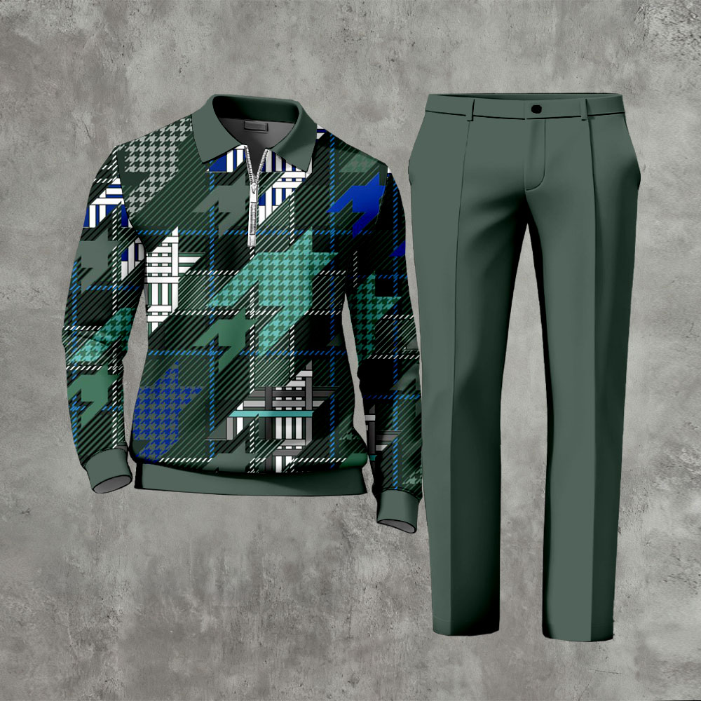 Men's Casual Houndstooth Green Color Matching Printed Polo-Collar Zipper Long-Sleeve Trousers Two-Piece Set