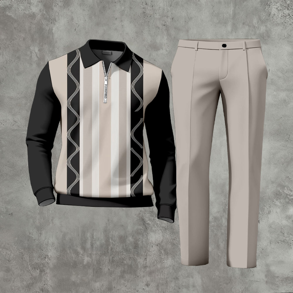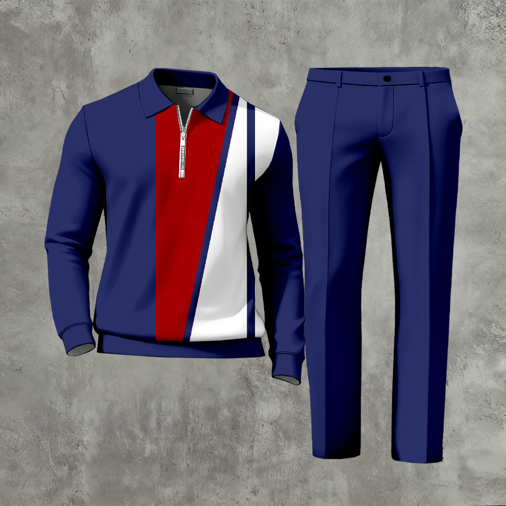 Men's Casual Color Matching Printed Polo-Collar Zipper Long-Sleeve Trousers Two-Piece Set