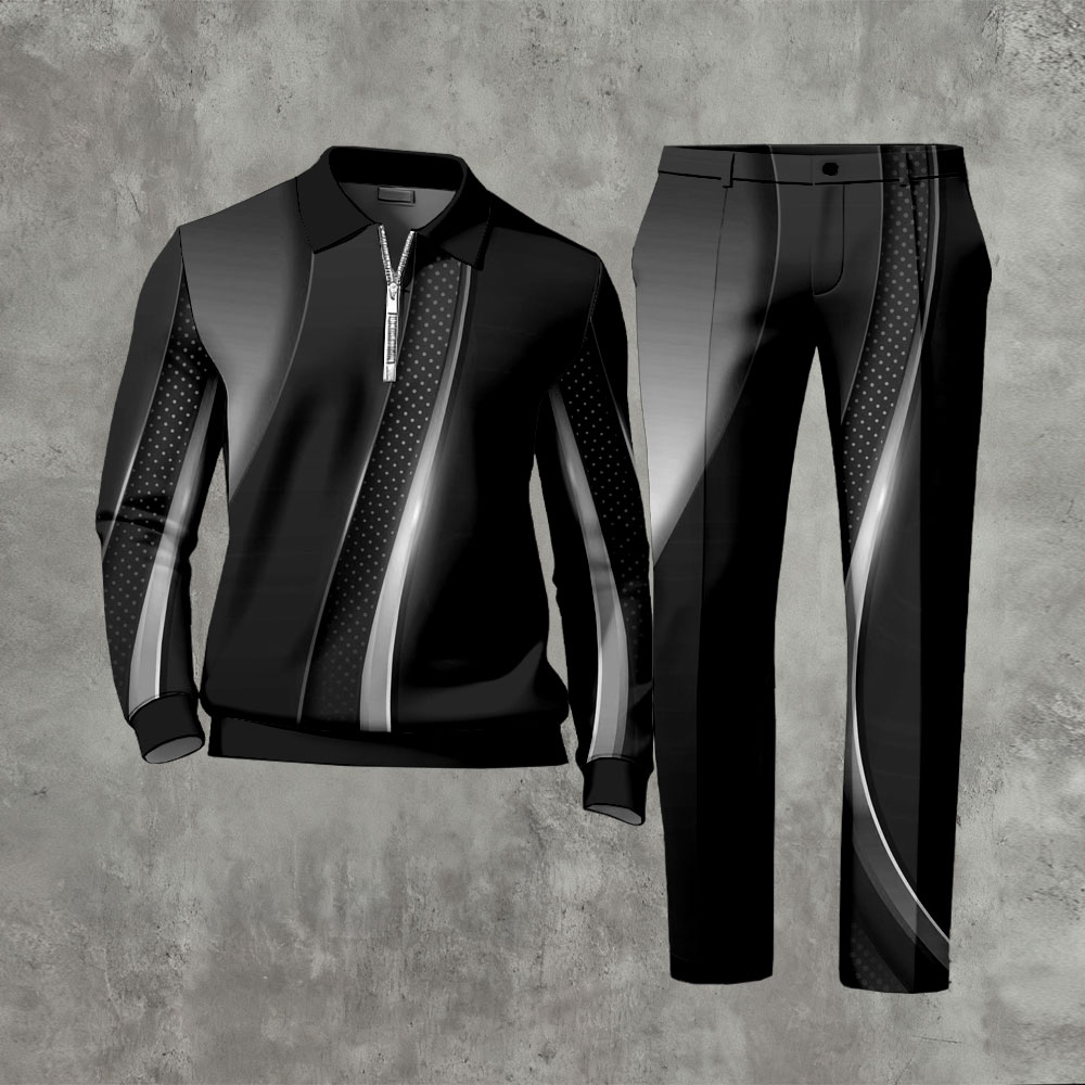 Men's Matching Printed Polo-Collar Zipper Long-Sleeve Trousers Two-Piece Set