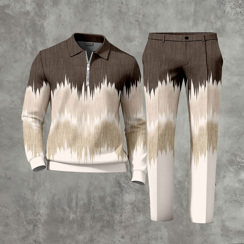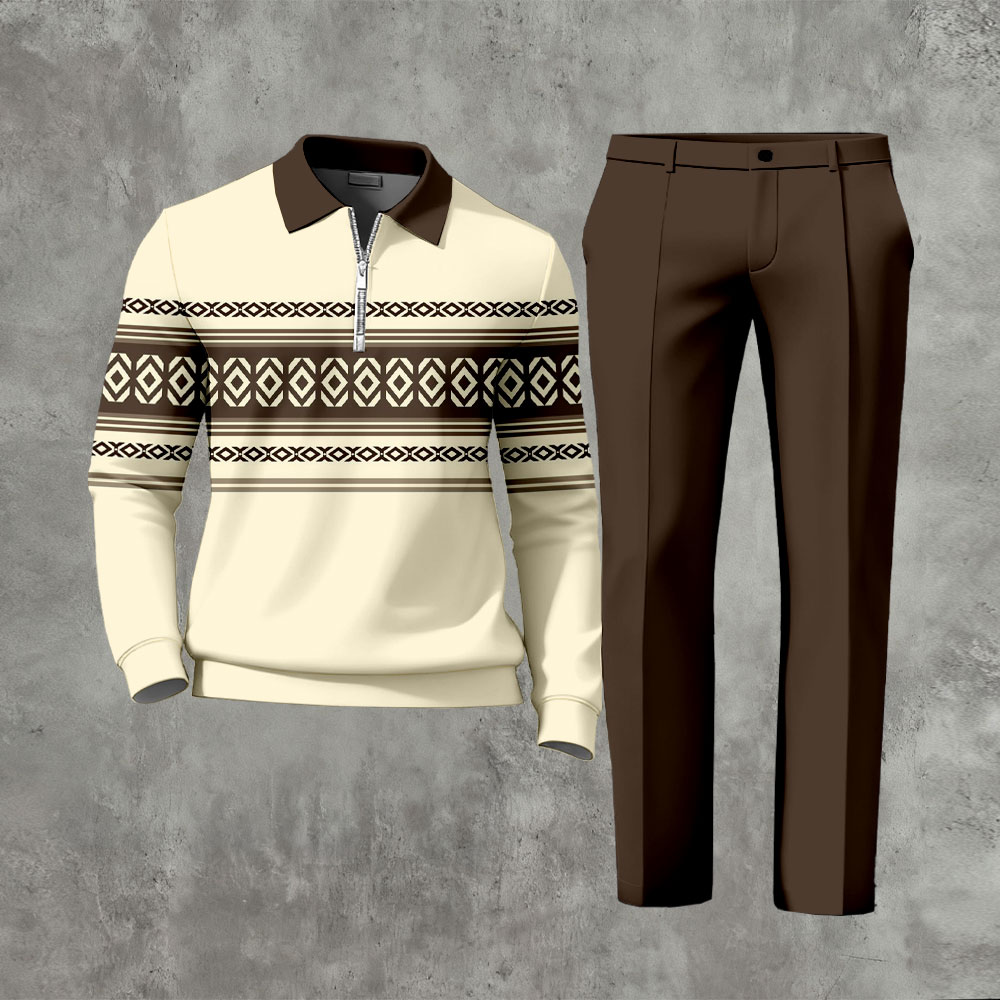 Men's Casual Color Brown & White Matching Geometric Printed Polo-Collar Zipper Long-Sleeve Trousers Two-Piece Set