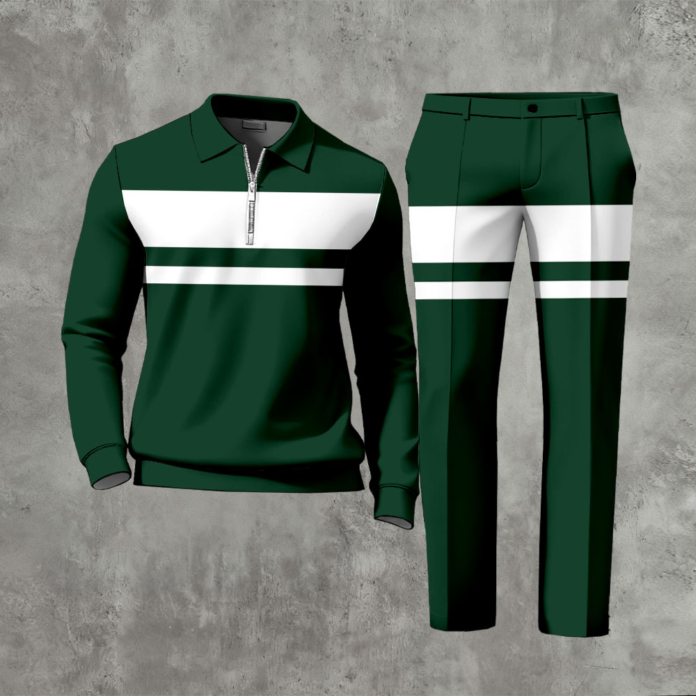 Men's Casual Green & White Color Matching Striped Printed Polo-Collar Zipper Long-Sleeve Trousers Two-Piece Set