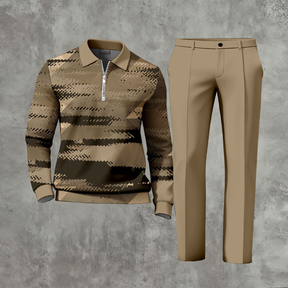 Men's Casual Brown Camouflage Color Matching Printed Polo-Collar Zipper Long-Sleeve Trousers Two-Piece Set