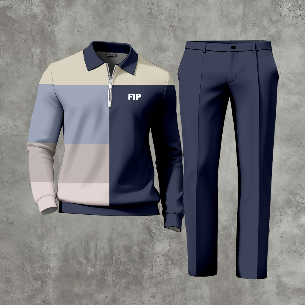 Men's Casual Navy Blue & Khaki Color Matching Geometric Printed Polo-Collar Zipper Long-Sleeve Trousers Two-Piece Set
