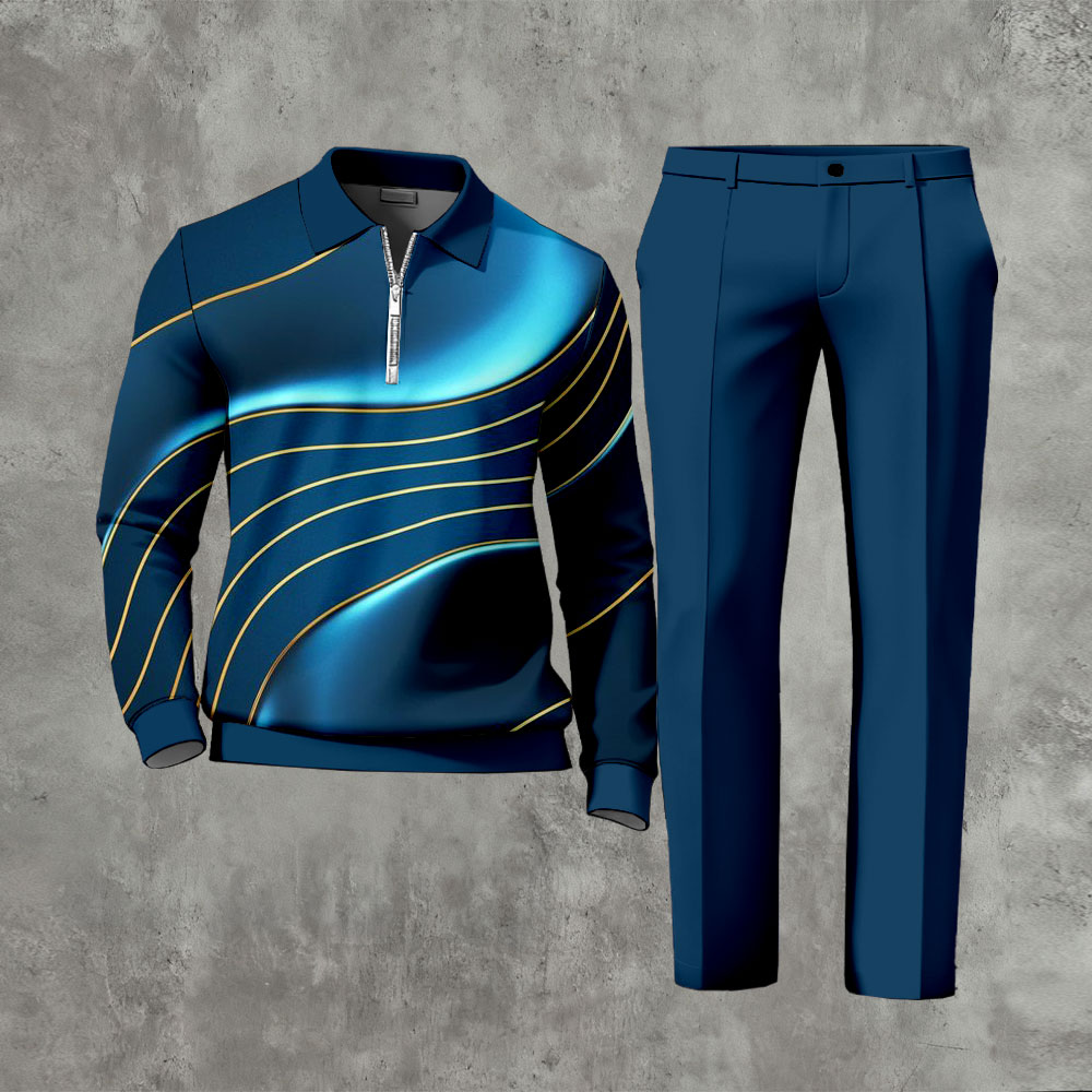 Men's Casual Blue Color Matching Geometric Printed Polo-Collar Zipper Long-Sleeve Trousers Two-Piece Set