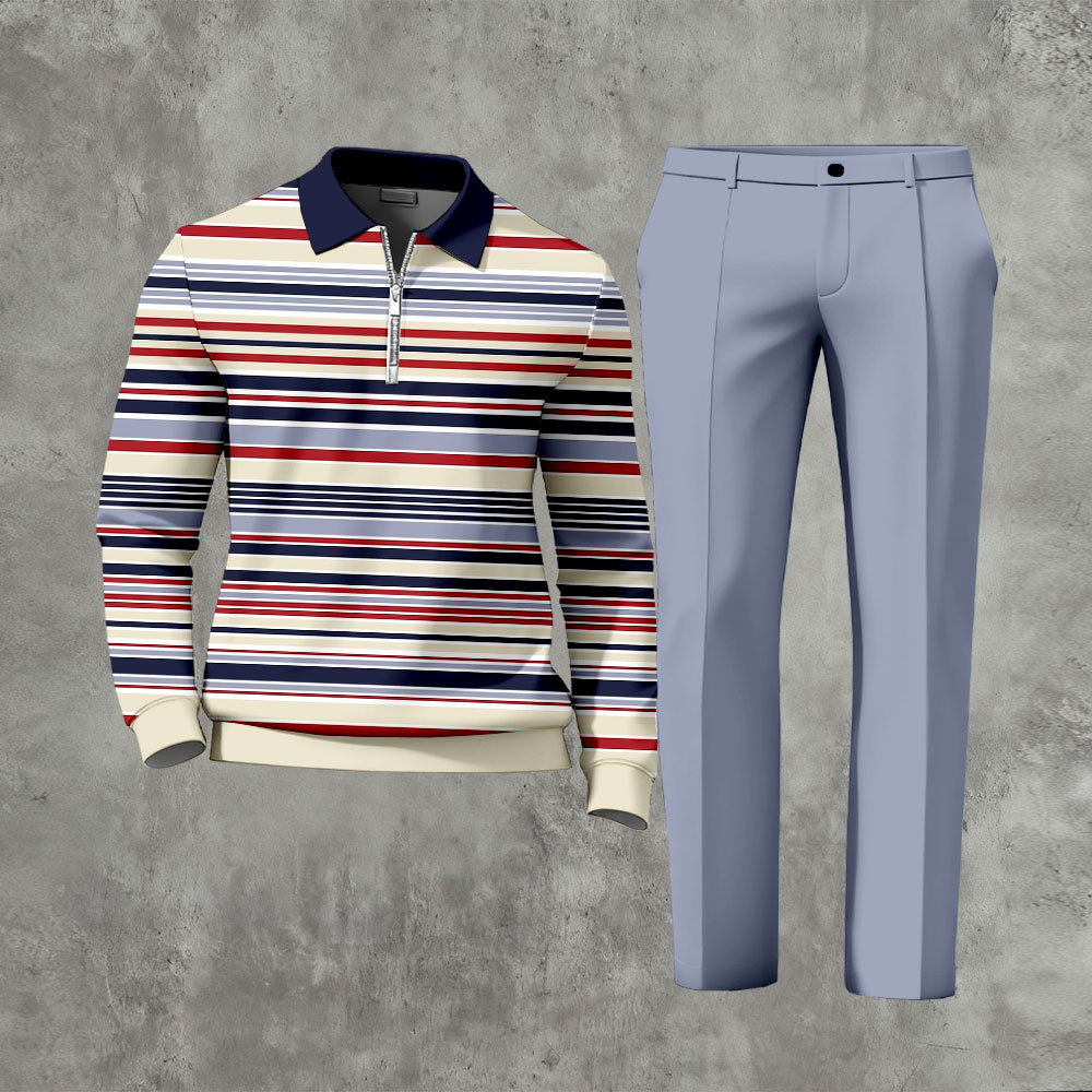 Men's Casual Blue Color Matching Striped Printed Polo-Collar Zipper Long-Sleeve Trousers Two-Piece Set