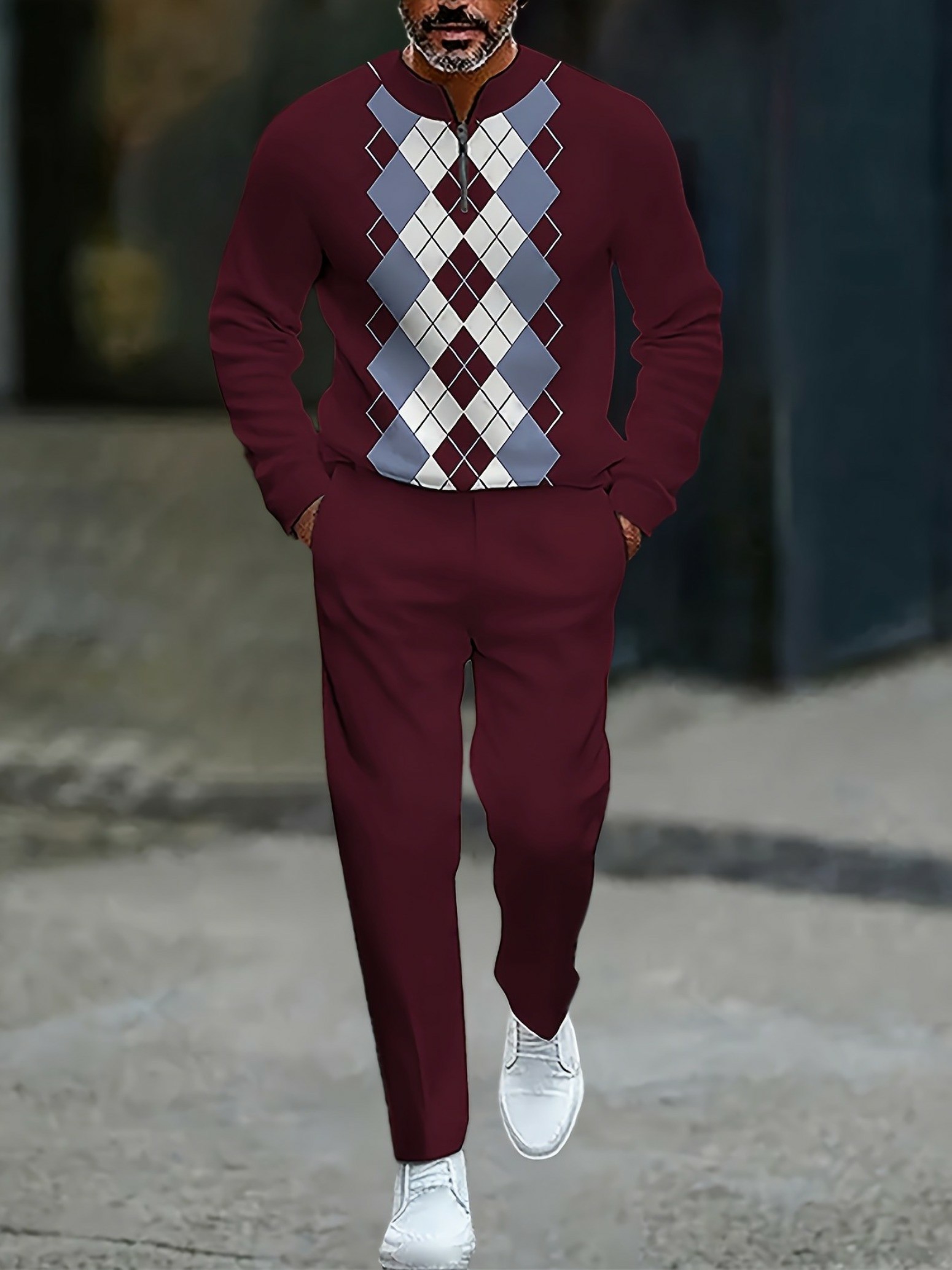 Men's Casual Maroon Color Matching Checked Printed Round-Neck Zipper Long-Sleeve Trousers Two-Piece Set