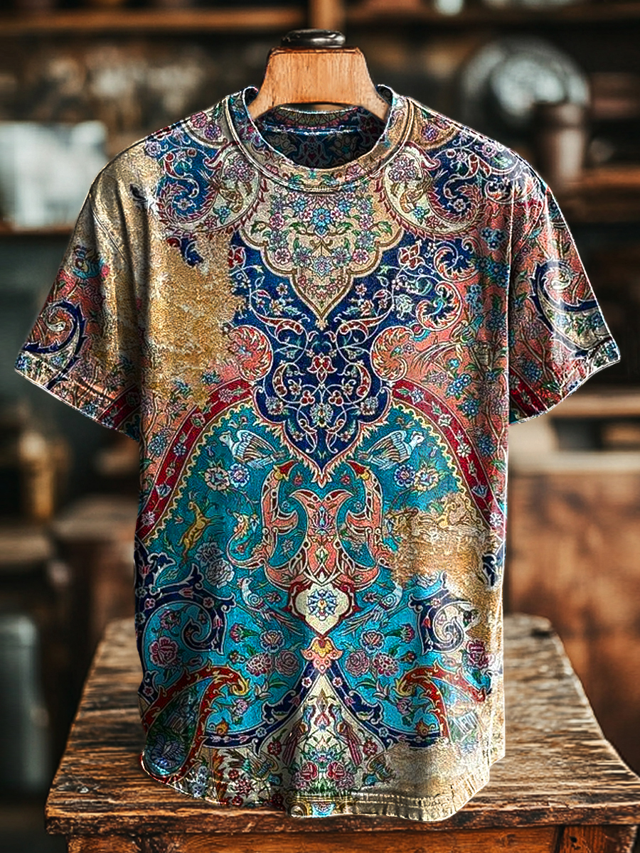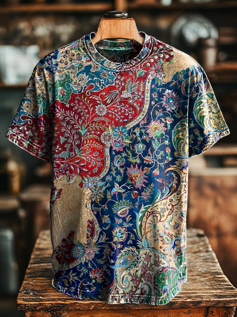Unisex Retro Ethnic Floral Print Casual Loose Short Sleeve T-Shirt