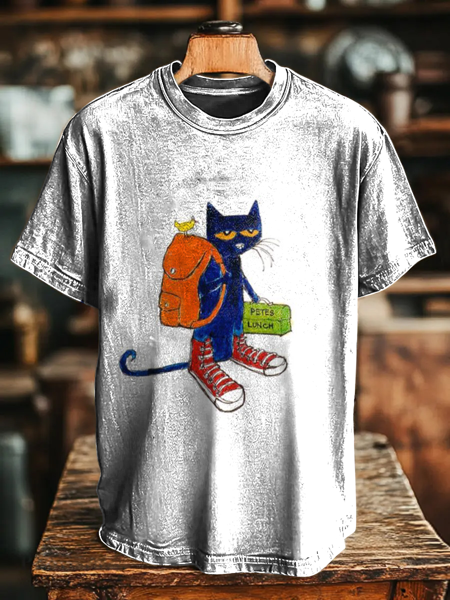 Retro Cat Carrying A School Bag Print Casual Short Sleeve T-shirt