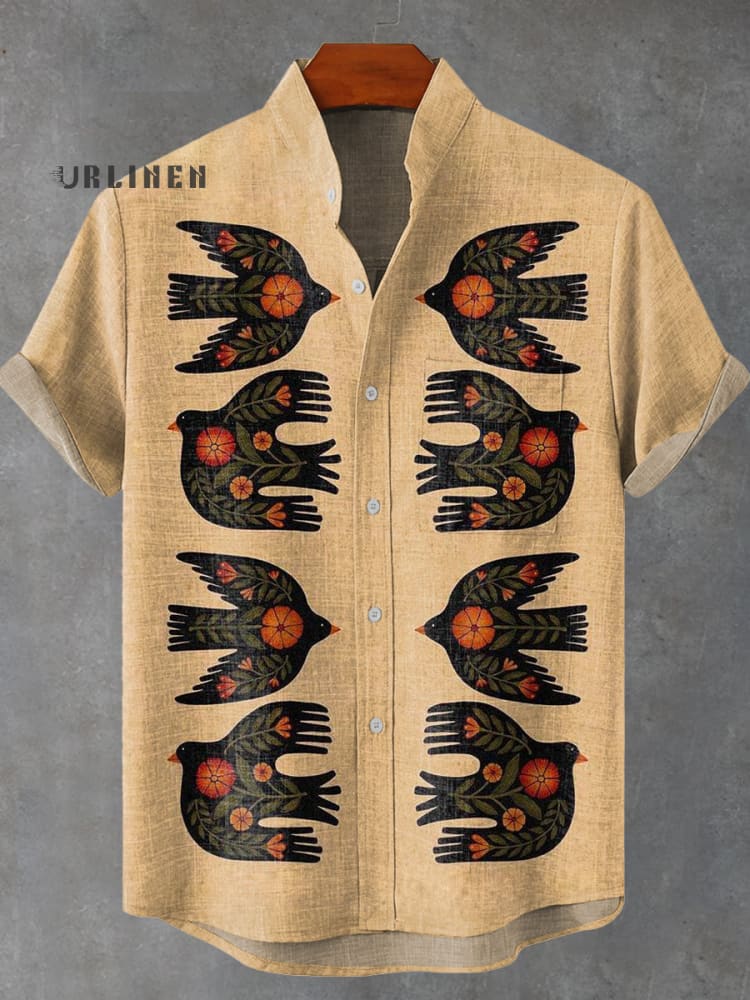 Retro Style Yellow Print Bird Pattern Print Casual 100% Cotton Shirt