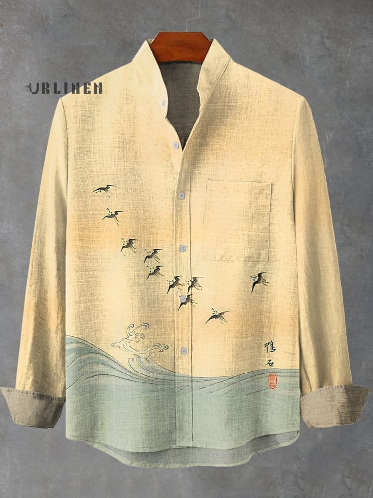 Retro Waves Seabirds Japanese Art Graphic Vintage Stripe Print 100% Cotton Long Sleeve Shirt