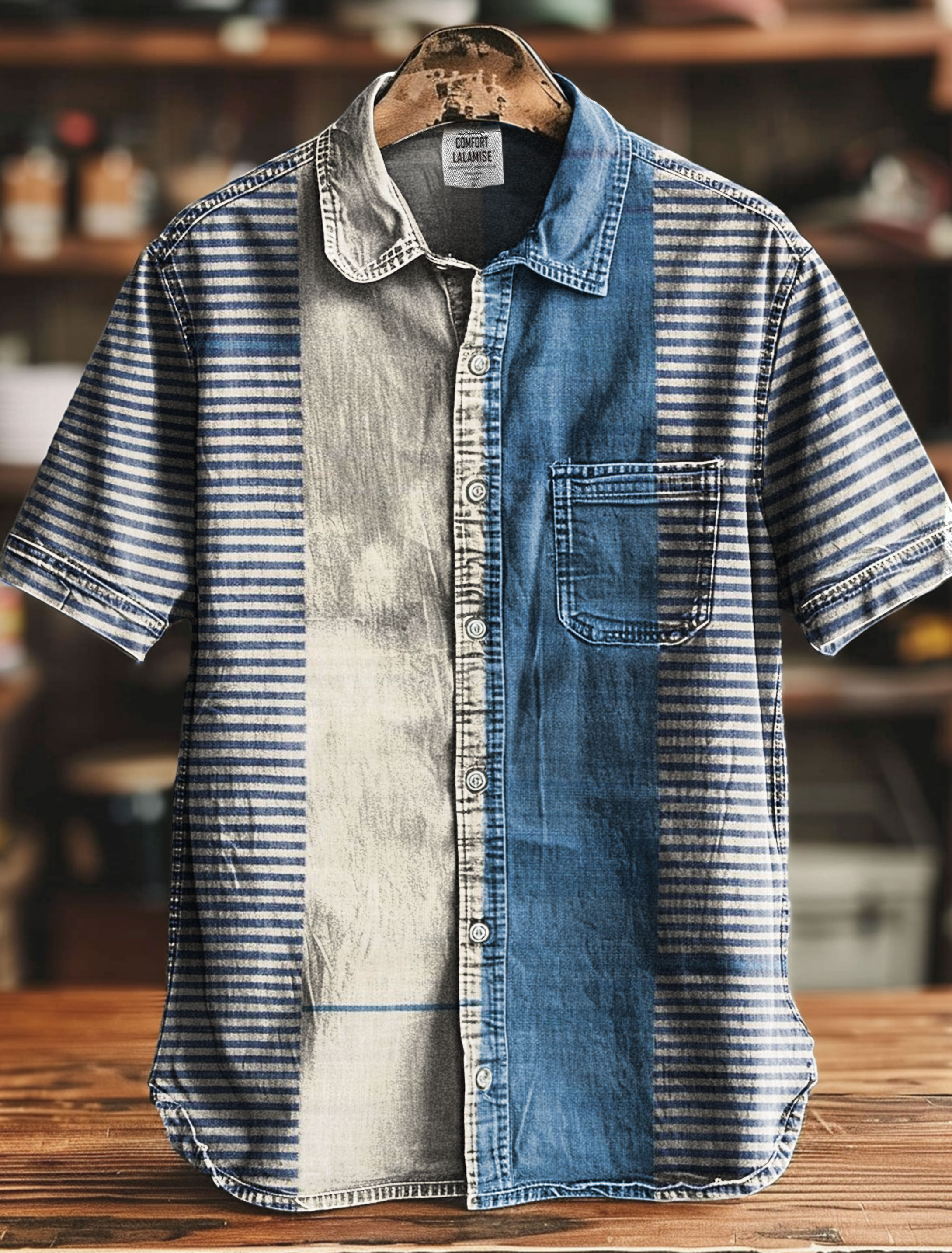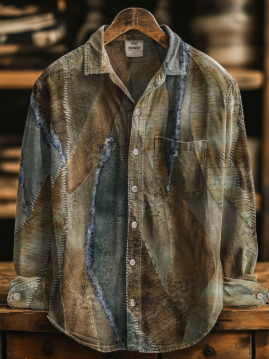 Retro Distressed Splicing Print 100% Cotton Long Sleeve Shirt