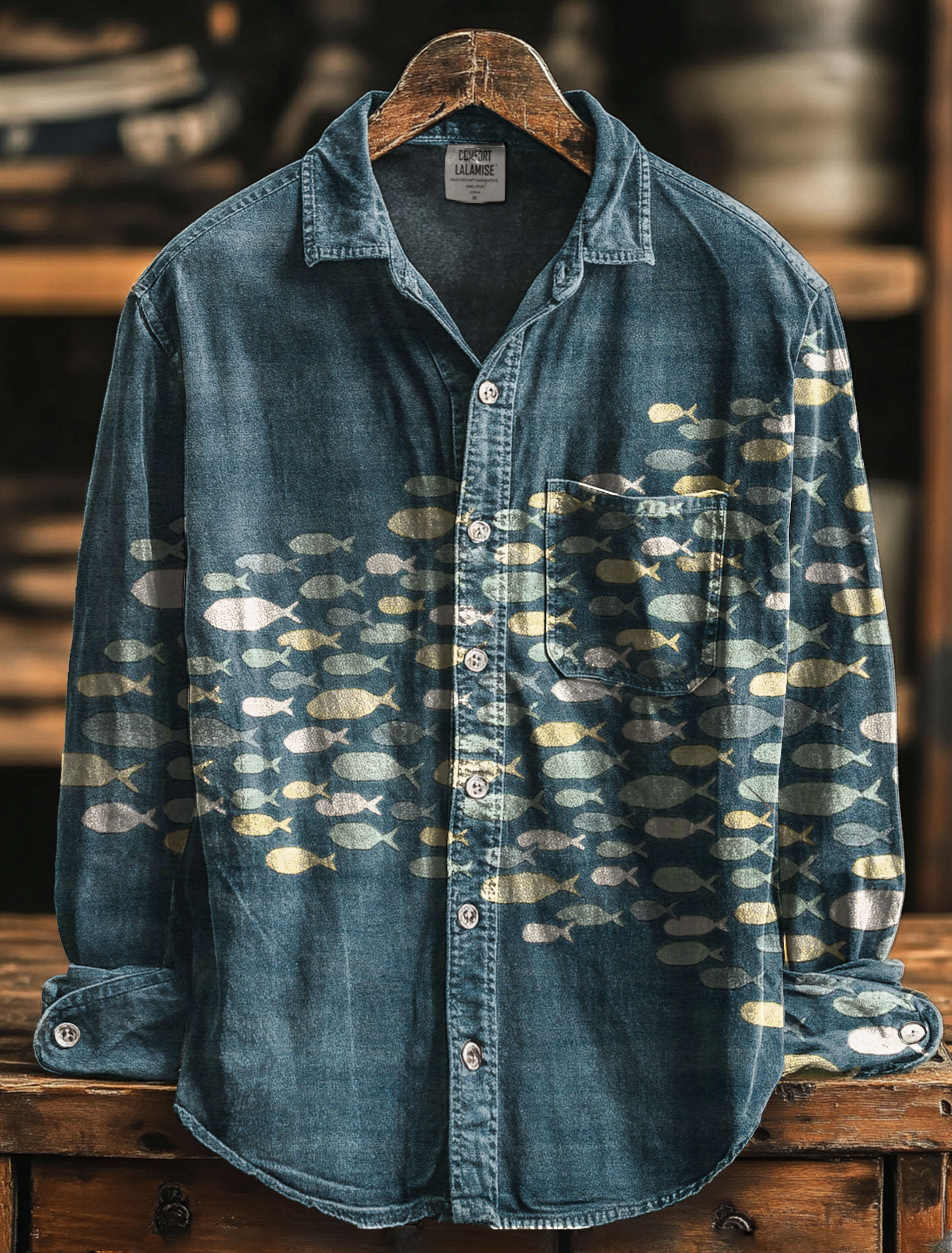Retro Fish School Print 100% Cotton Long Sleeve Shirt