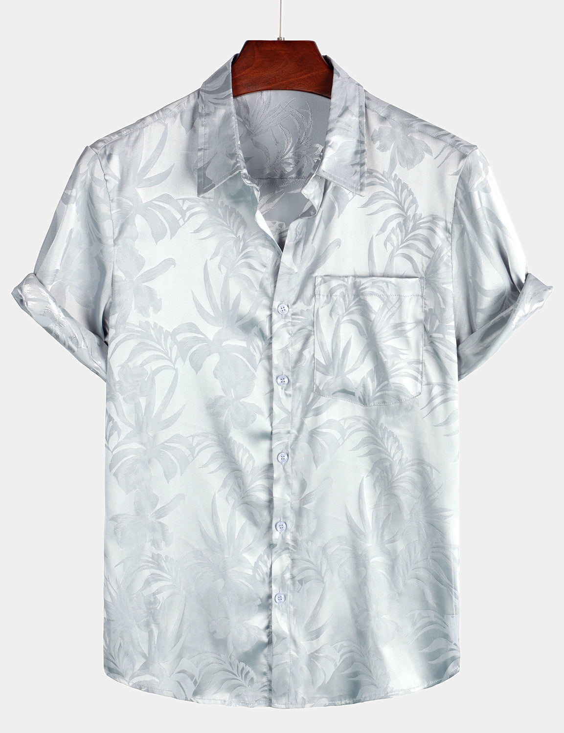 Men's Floral Jacquard Pocket Silky Satin Short Sleeve Shirt