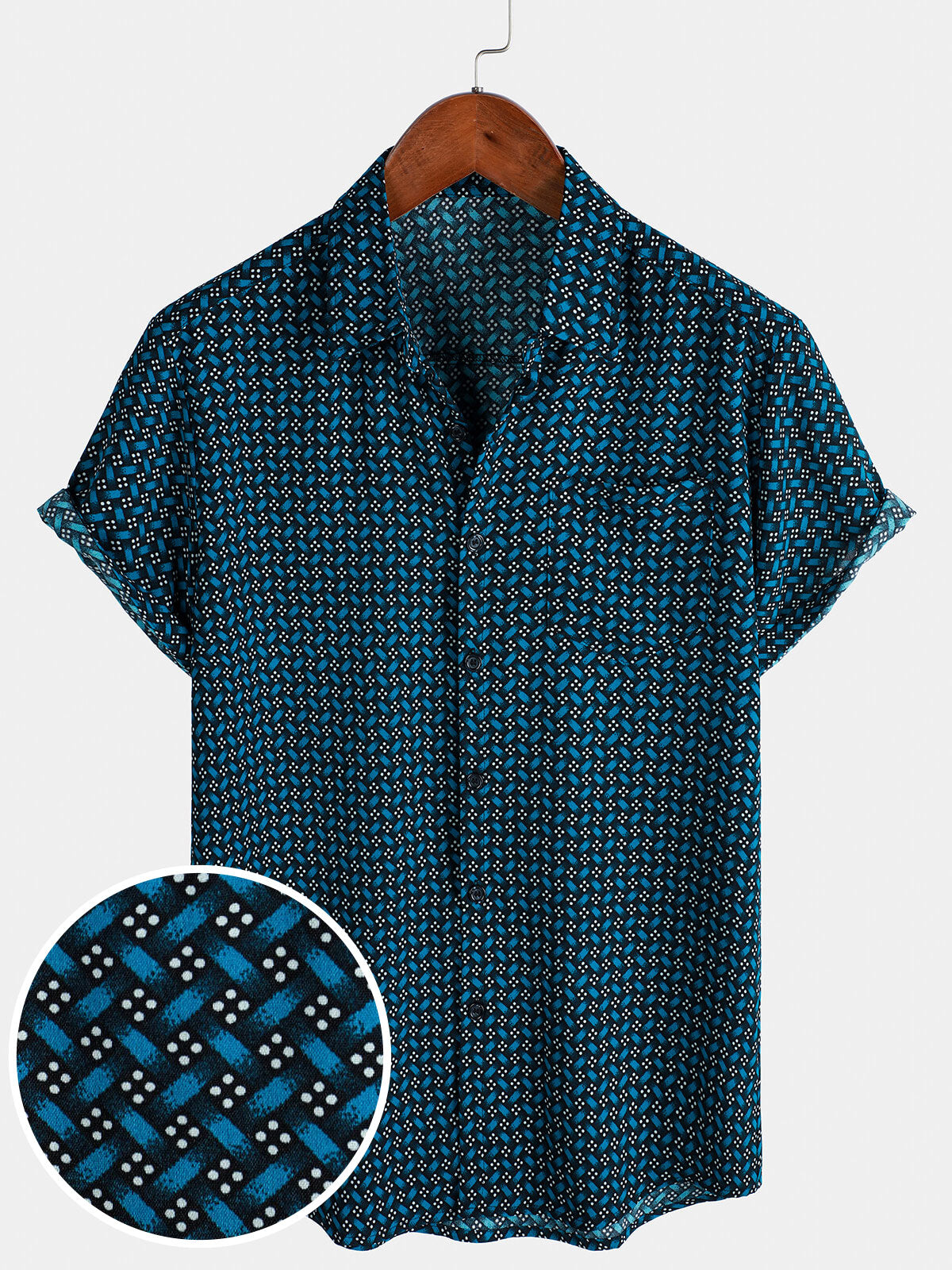 Men's Casual Holiday Geometrie Summer Short Sleeve Blue Button Up Shirt
