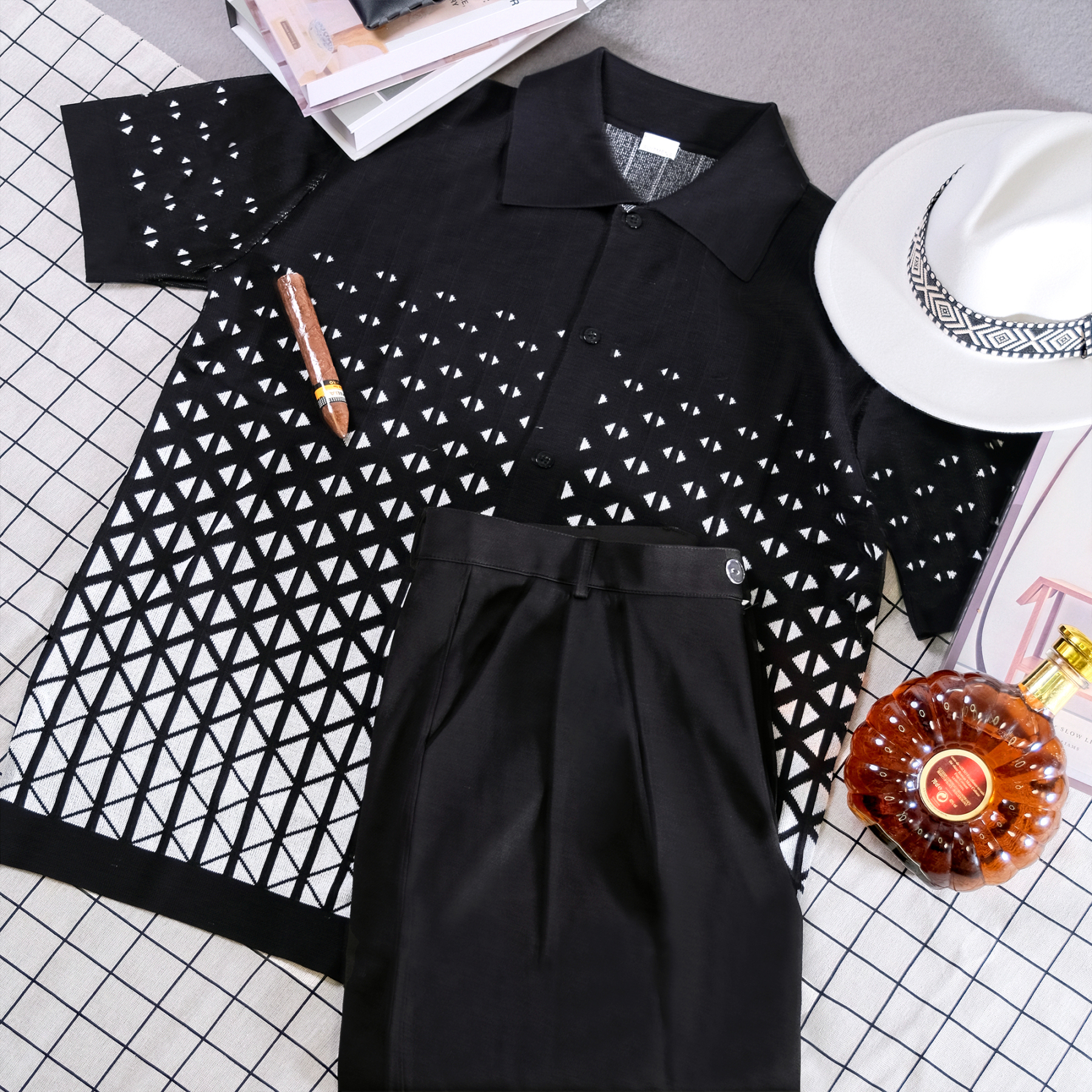 Black Criss Cross Pattern Walking Suit Short Sleeve Set