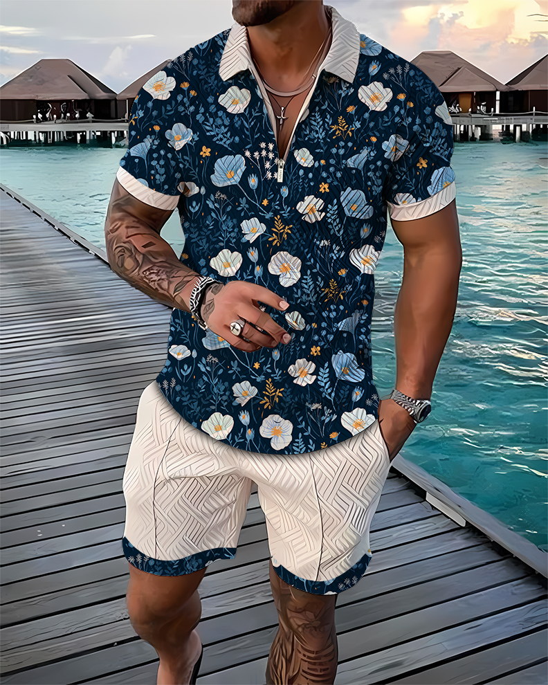 Blue Blossom Polo Shirt And Shorts Mediterranean Style Suits