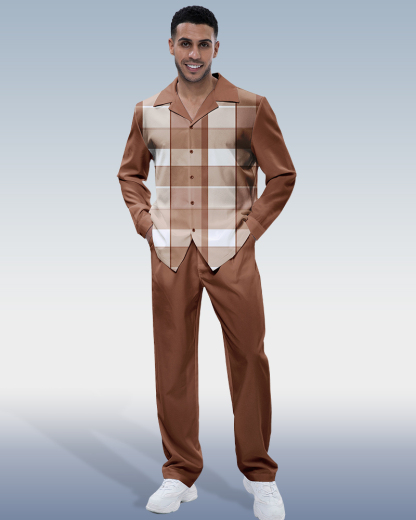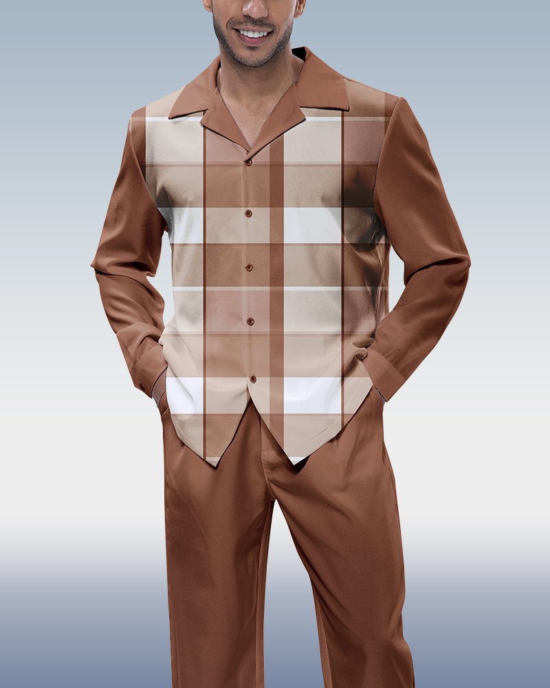 Brown Plaid Long Sleeve Shirt Walking Set