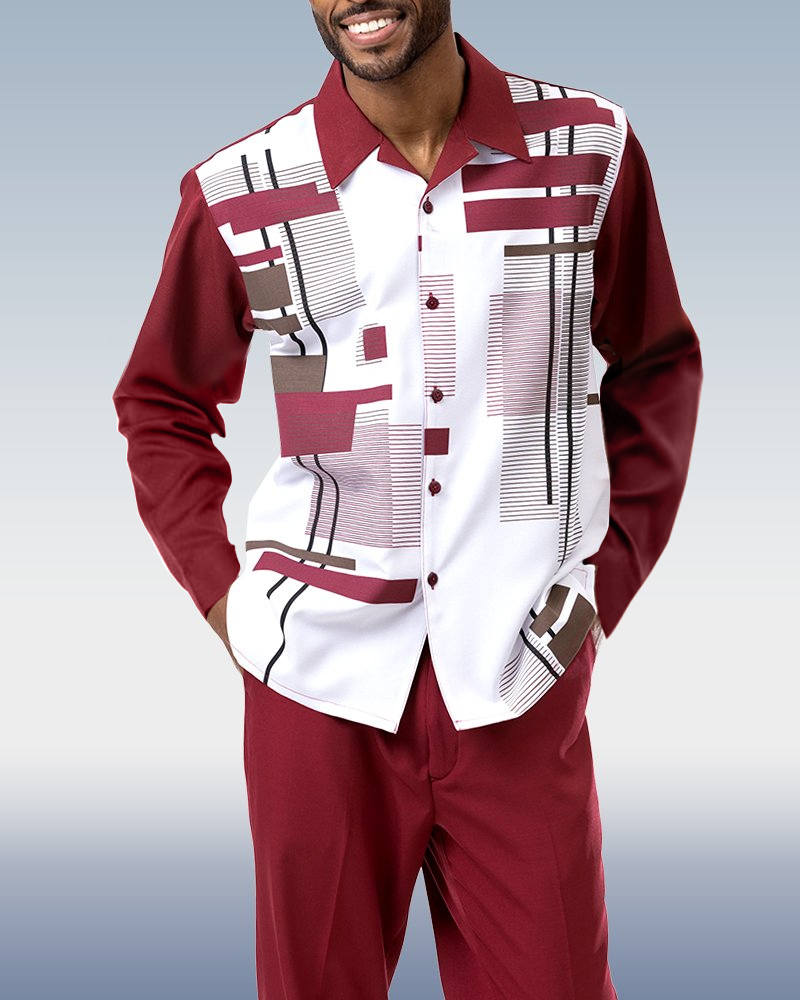 Men's Burgundy Geometric Print Walking Suit 2 Piece LongSleeve Set