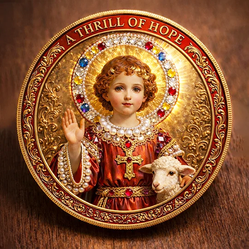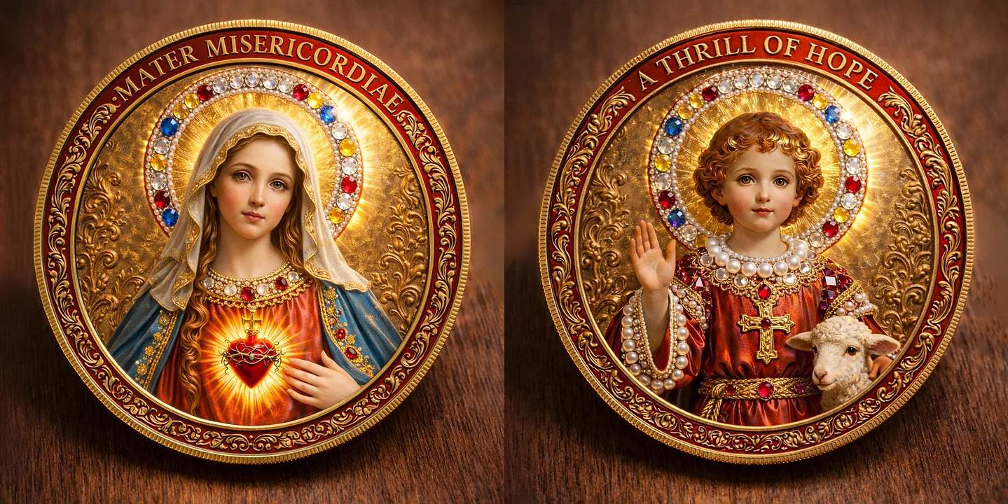 Crafted as a two-sided devotional story, this commemorative coin speaks without words — one side of compassion, one side of promise.