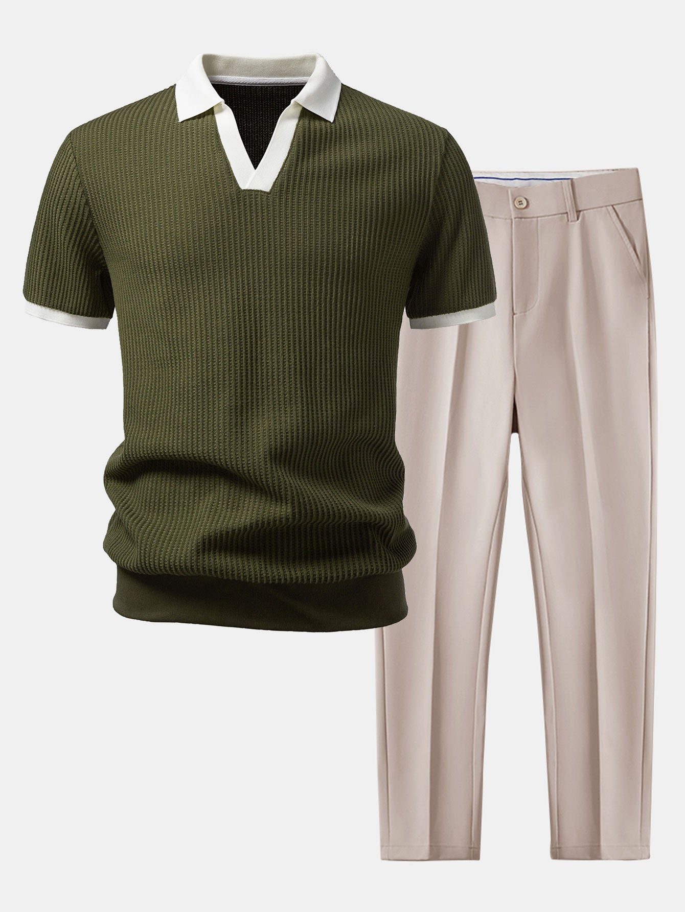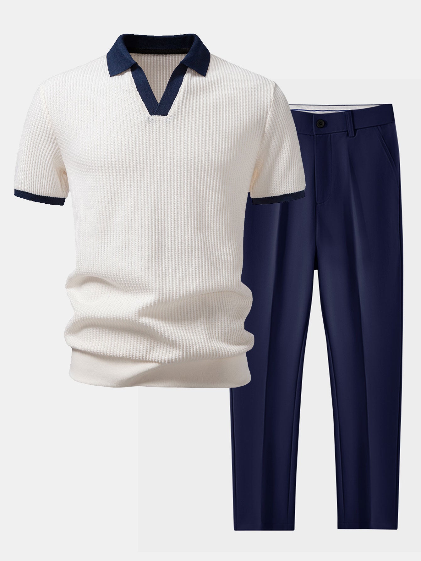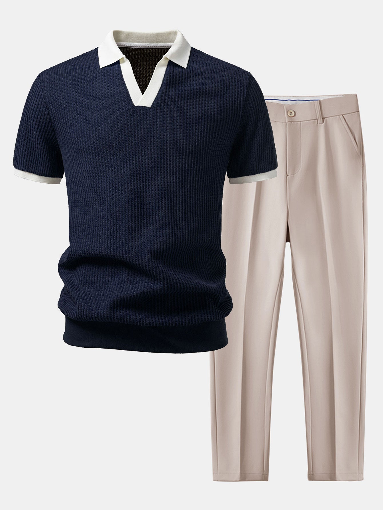 Refresh your smart-casual wardrobe with this contrast knit waffle johnny collar polo & slim fit tapered trousers set, designed to balance modern style with everyday comfort. Crafted from textured knit waffle fabric, this two-piece outfit delivers a breathable, soft feel with a polished finish.
