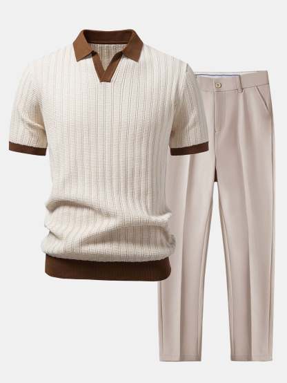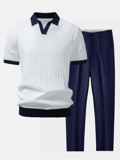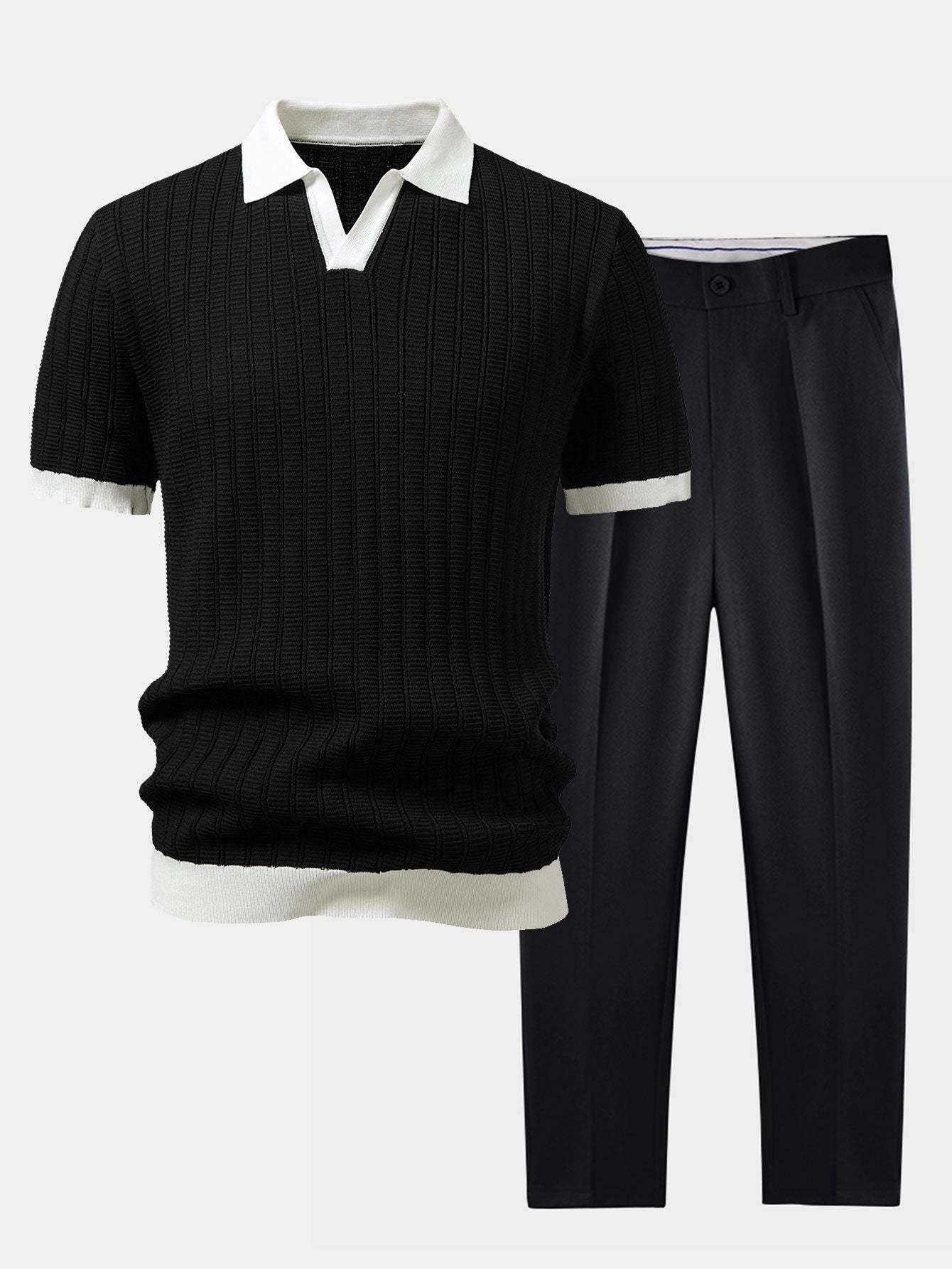 Elevate your smart-casual style with this contrast textured johnny collar polo & slim fit tapered trousers set, designed for a refined look with modern appeal. Crafted from soft, breathable fabrics, this coordinated outfit offers comfort and effortless sophistication.