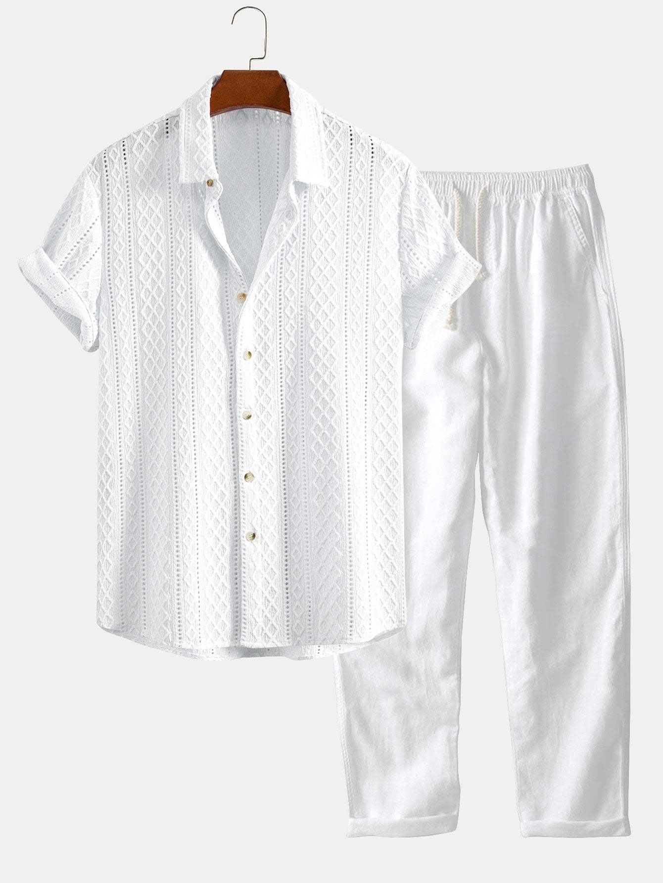 Refresh your warm-weather wardrobe with this geometry rhombus jacquard button up shirt & straight leg linen pants set, designed for effortless style and comfort. Crafted from lightweight, breathable fabrics, this matching set offers a relaxed yet refined look ideal for everyday wear or casual outings.