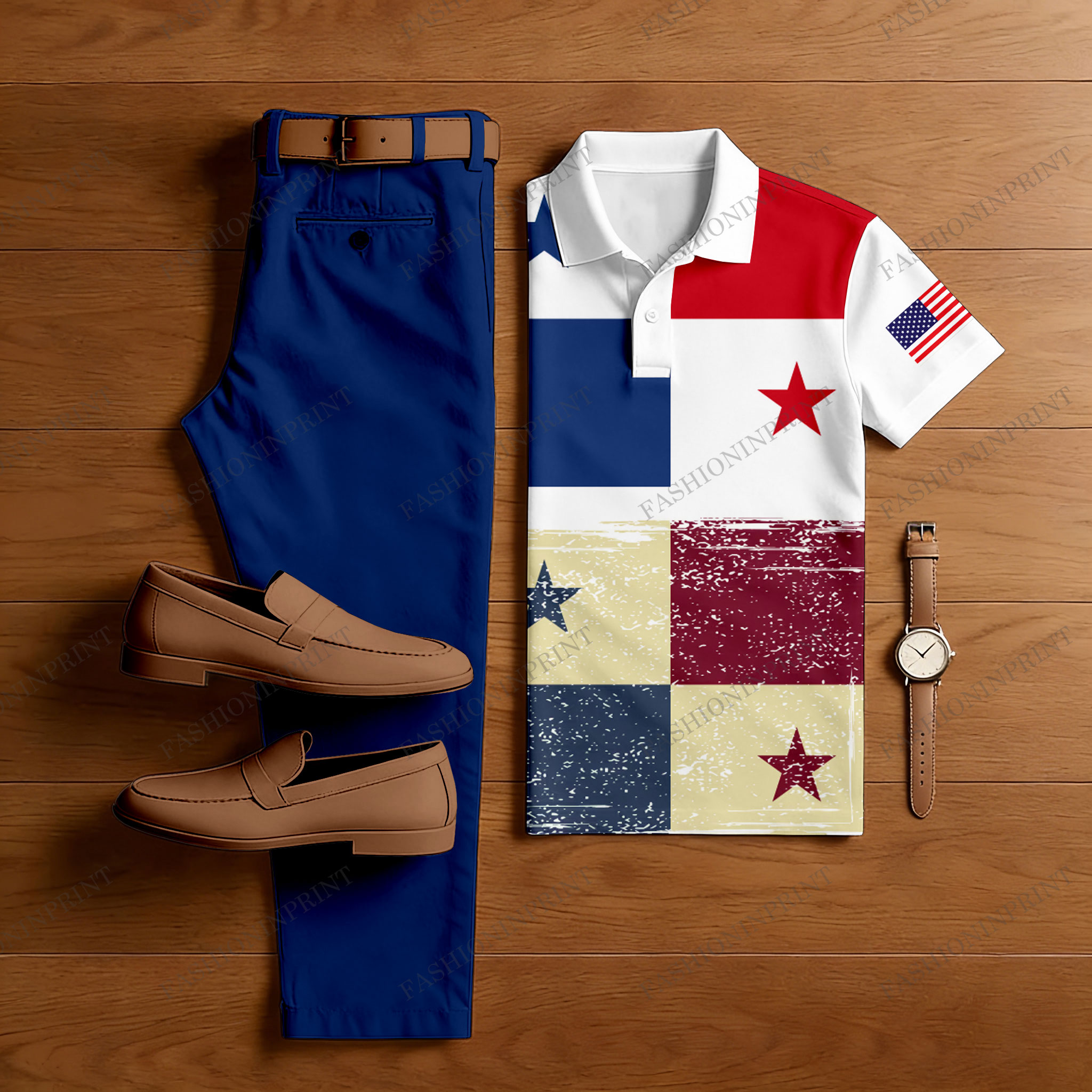 Men's 250Th Anniversary Royal Blue & Multi Color Matching Checkered Printed Short Sleeved Polo Shirt & Trousers Two-Piece Set