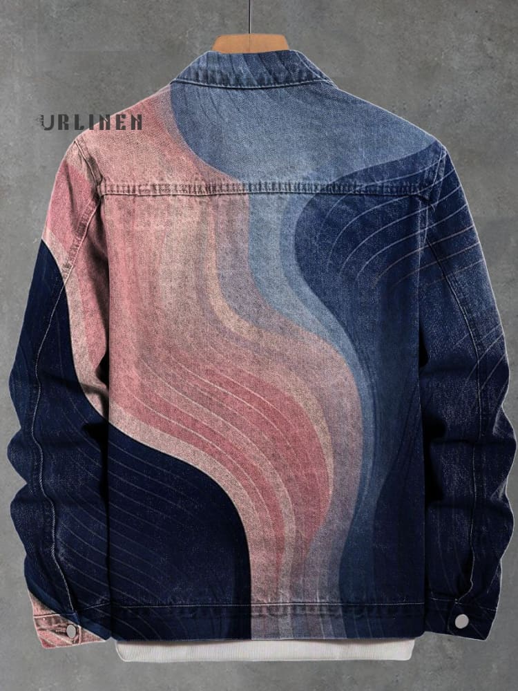 Men's Art Blue and Pink Colour Block Vintage Print Casual Denim Jacket