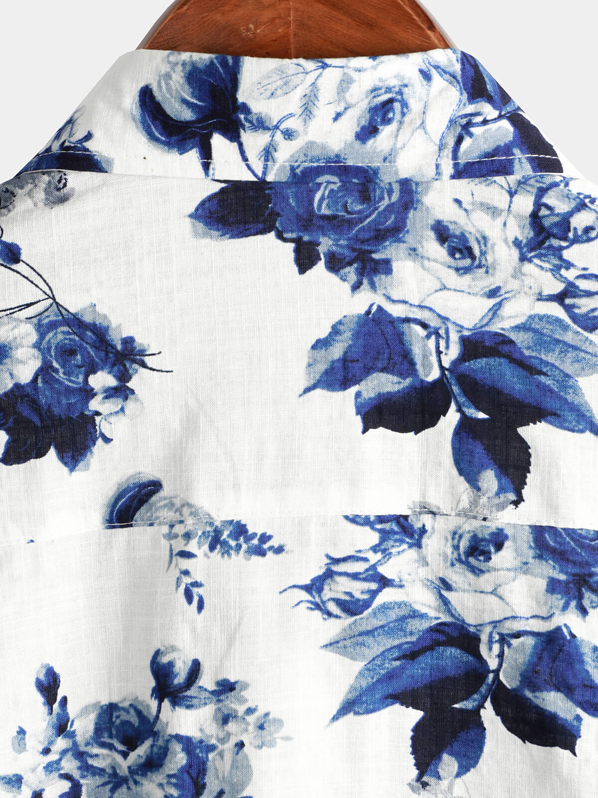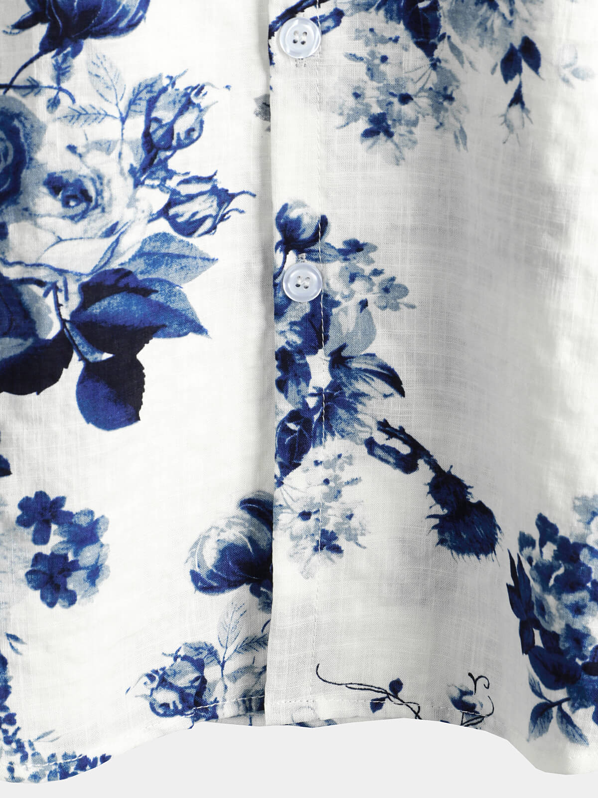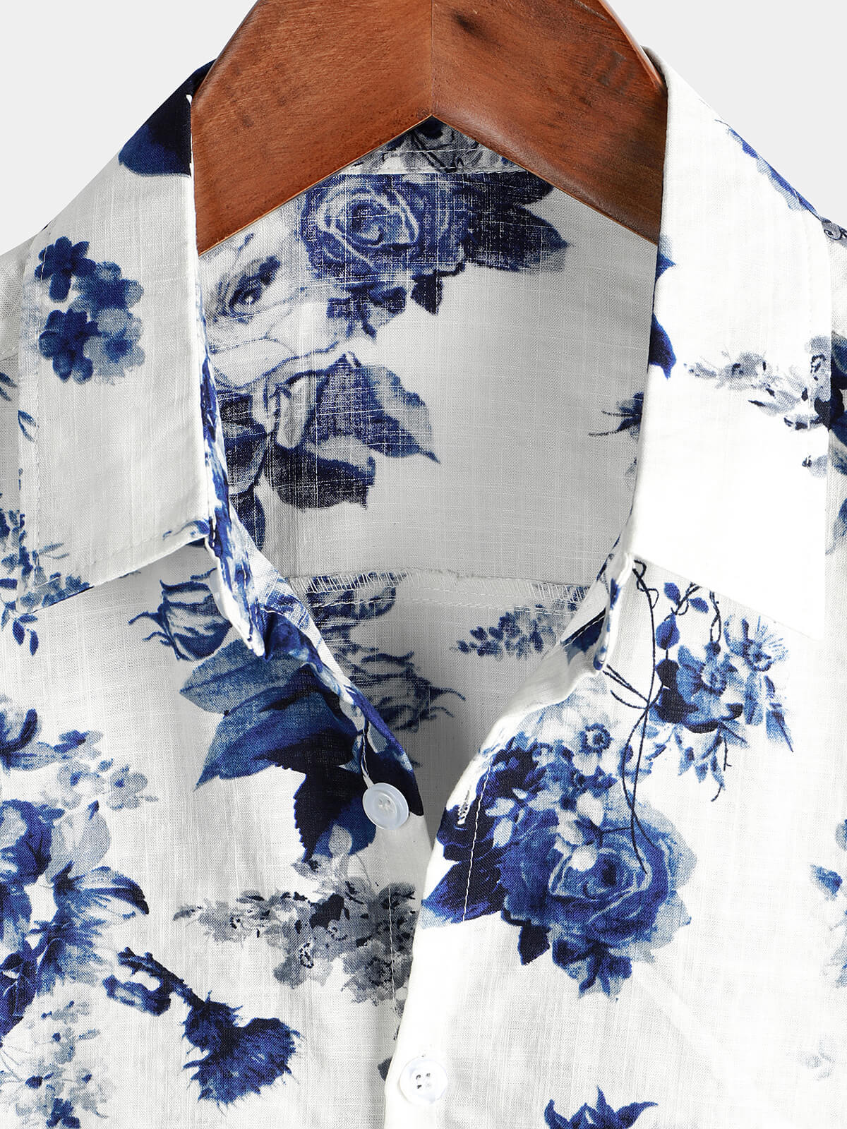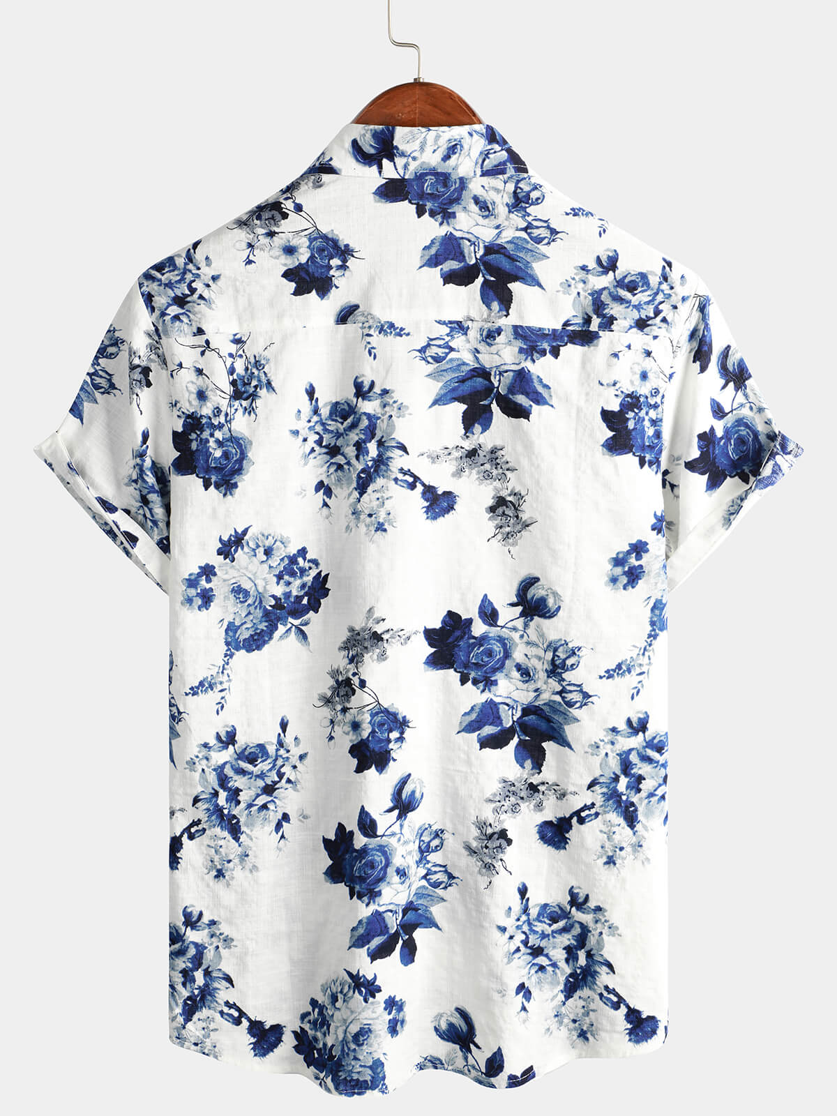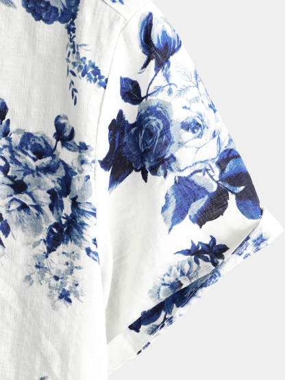 Men's Blue Floral Print Cotton Beach Holiday Button Up Short Sleeve White Lapel Hawaiian Shirt