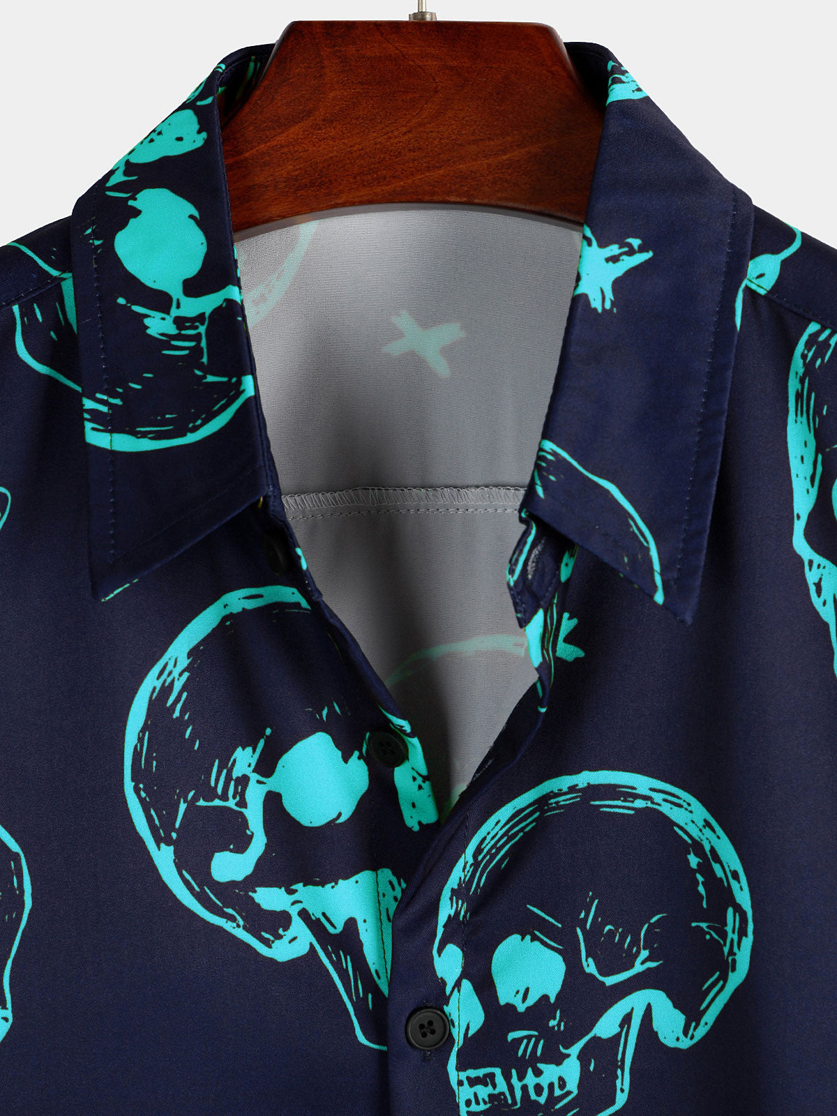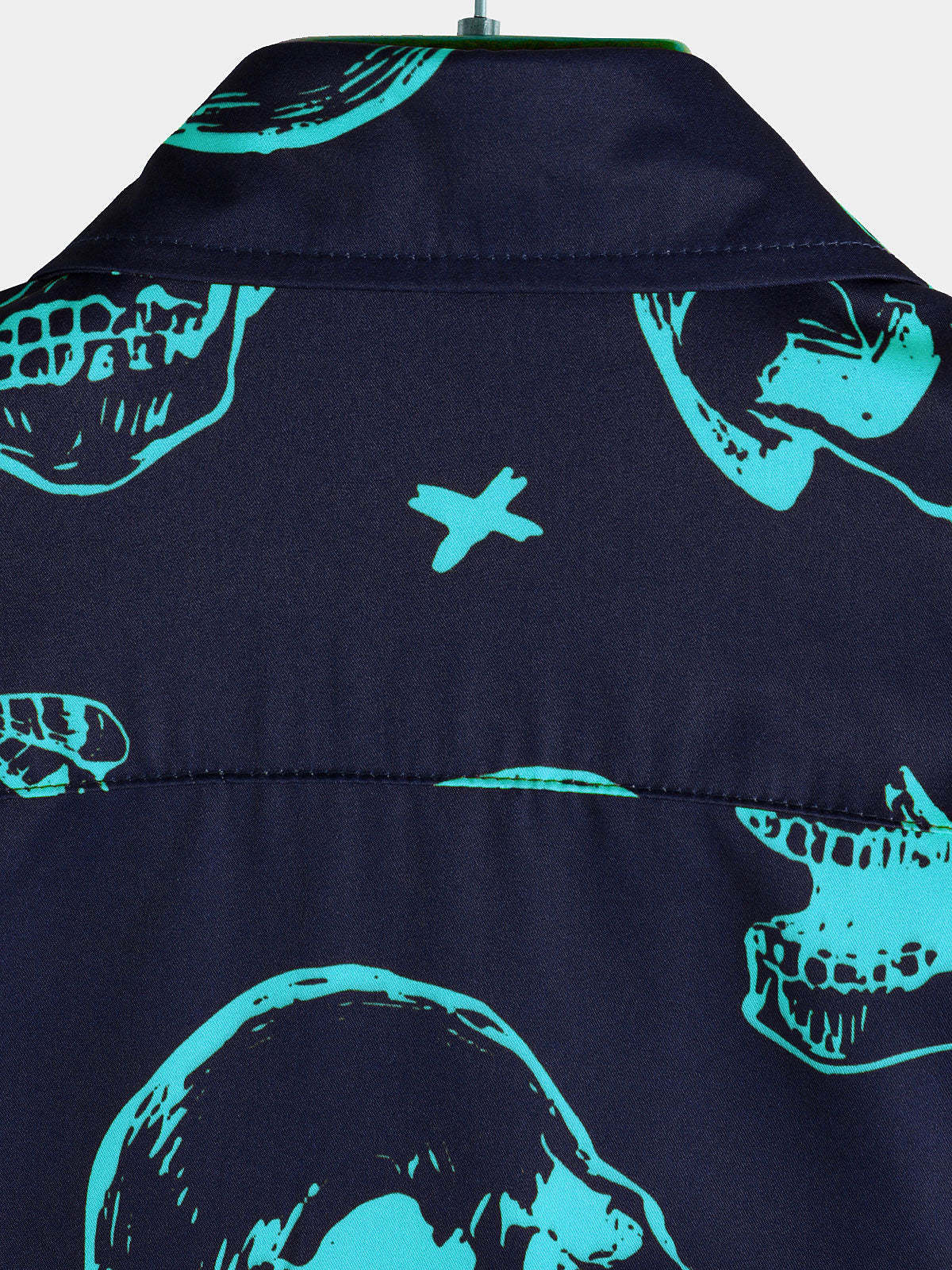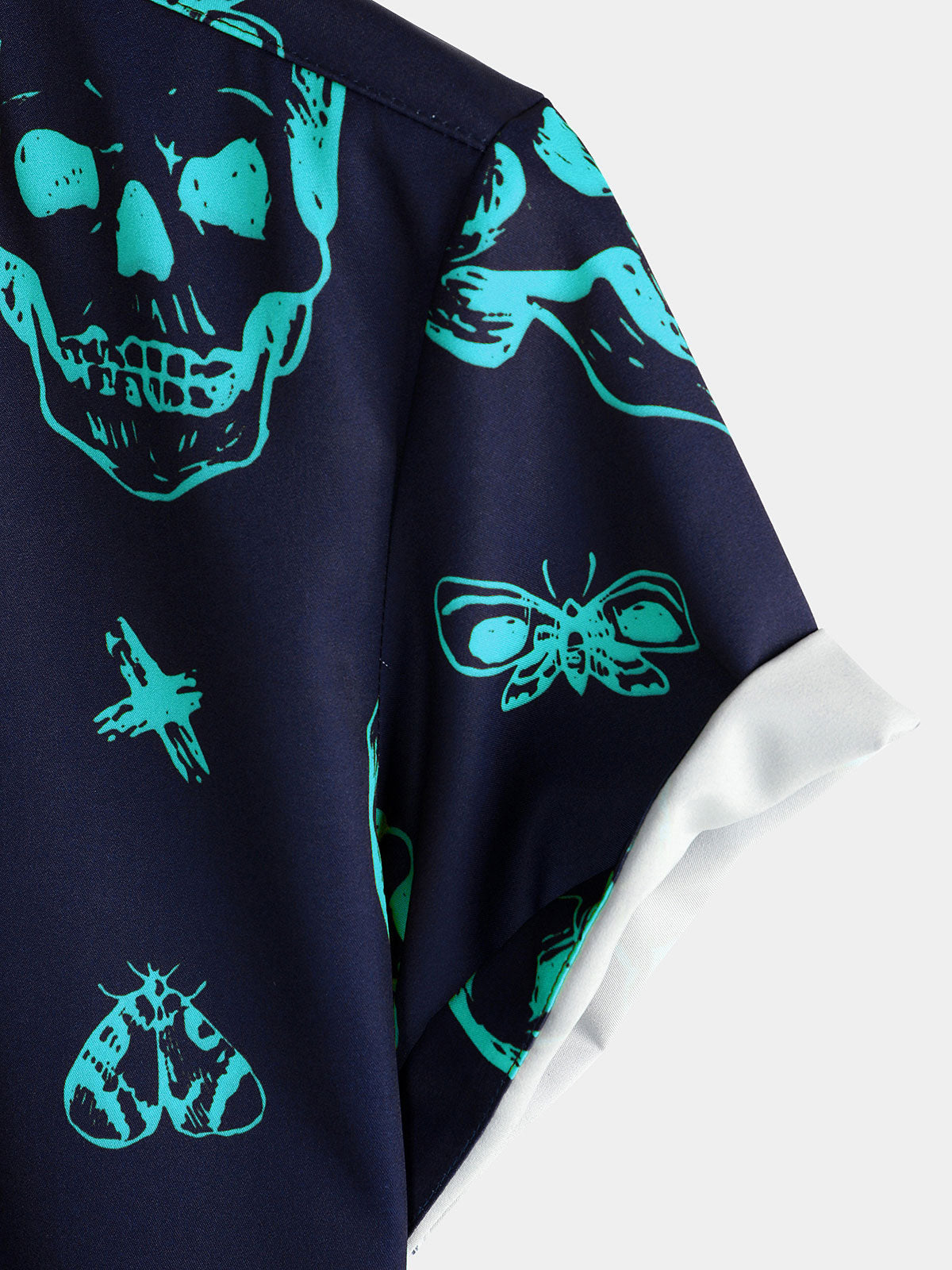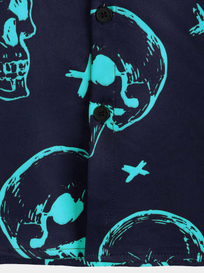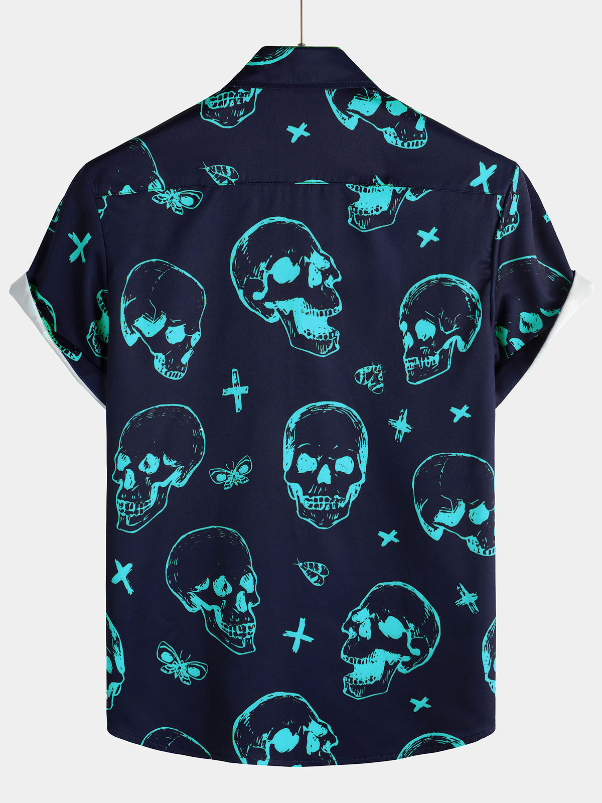 Men's Blue Skull Print Art Graphic Button Short Sleeve Aloha Hawaiian Shirt