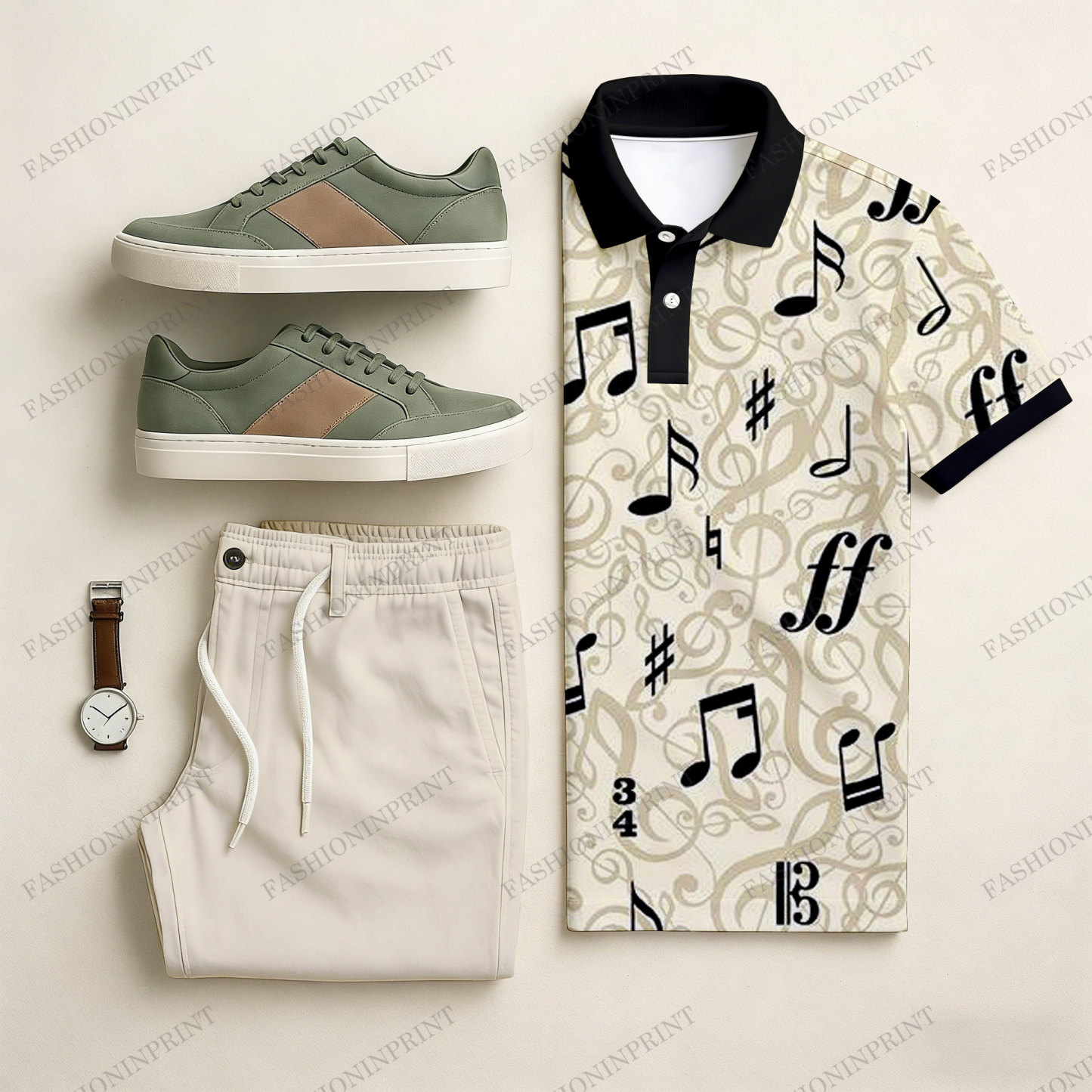 Men's Casual Apricot & Black Color Matching Art Printed Short Sleeved Polo Shirt & Trousers Two-Piece Set