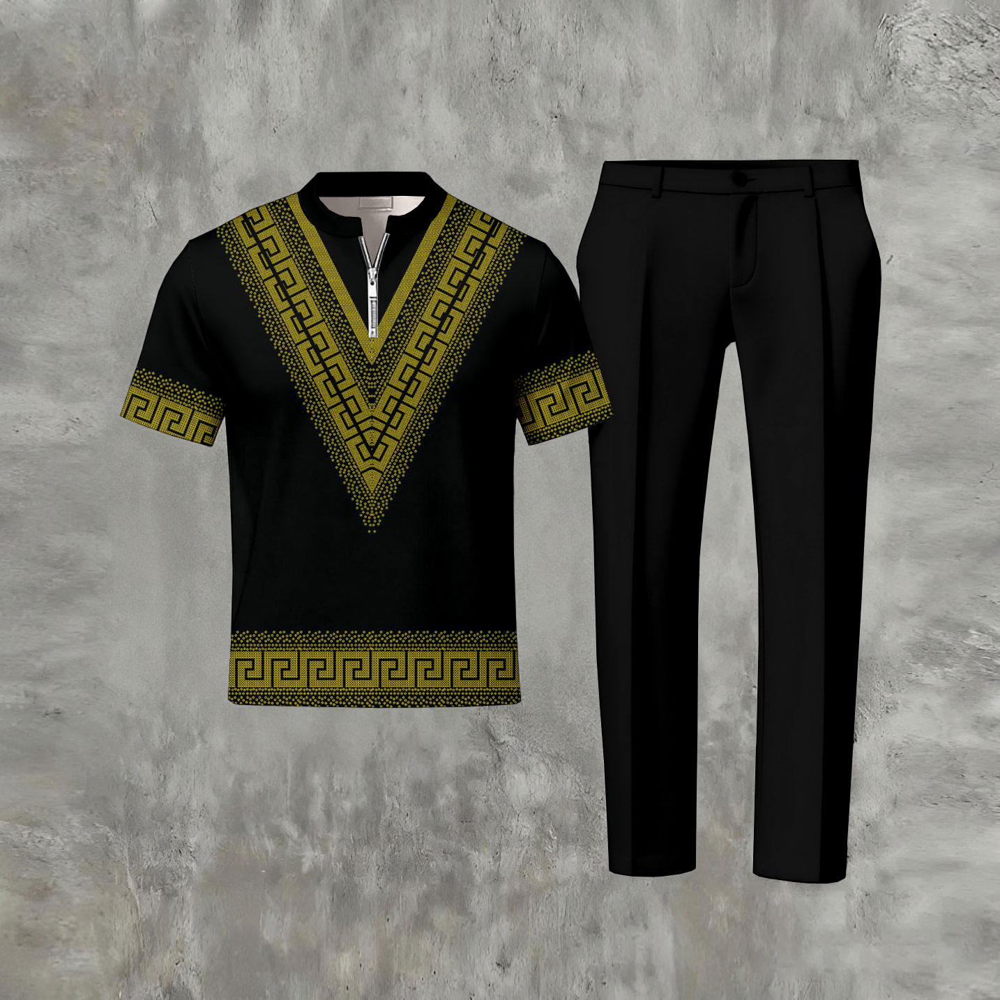 Men's Casual Black & Army Green Color Matching Ethnic Pattern Round Neck Zipper Short Sleeved T-Shirt & Trousers Two-Piece Set