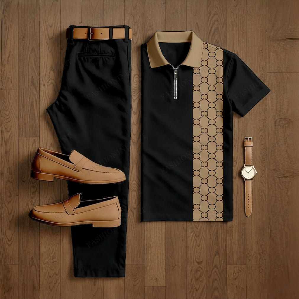 Men's Casual Black & Brown Color Matching Retro Style Checkered Printed Short Sleeved Polo Shirt & Trousers Two-Piece Set