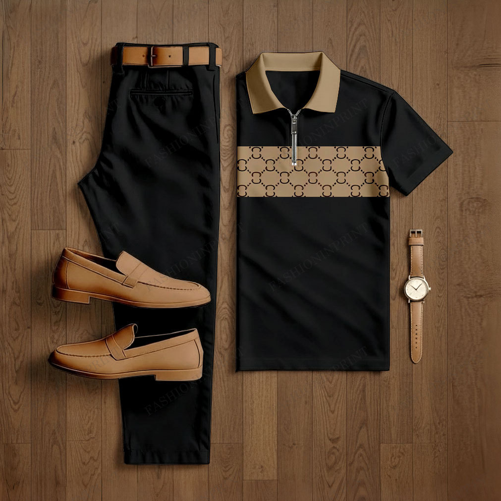 Men's Casual Black & Brown Color Matching Retro Style Checkered Printed Short Sleeved Polo Shirt & Trousers Two-Piece Set – Mentalmens