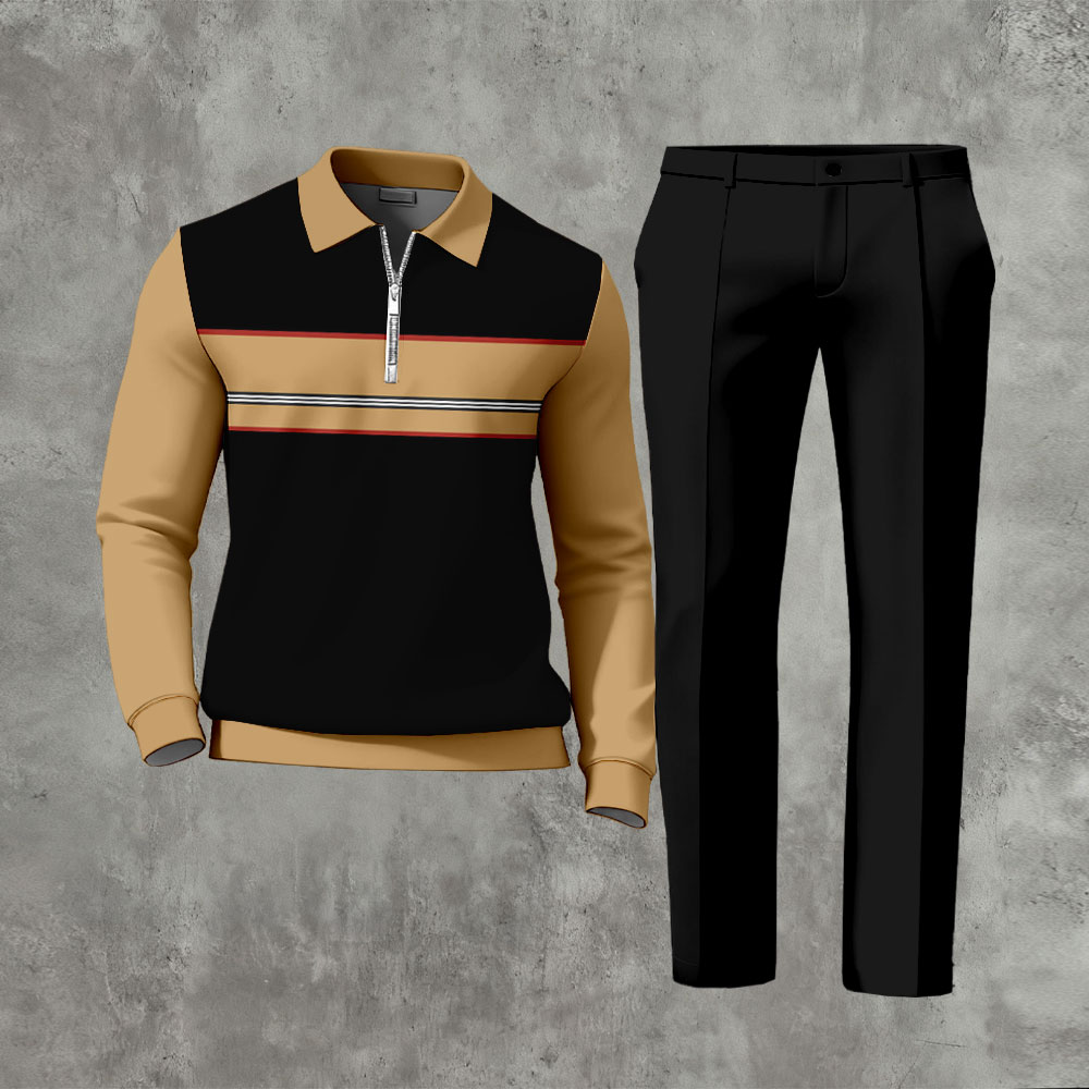 Men's Casual Black & Coffee Color Matching Geometric Printed Polo-Collar Zipper Long-Sleeve Trousers Two-Piece Set