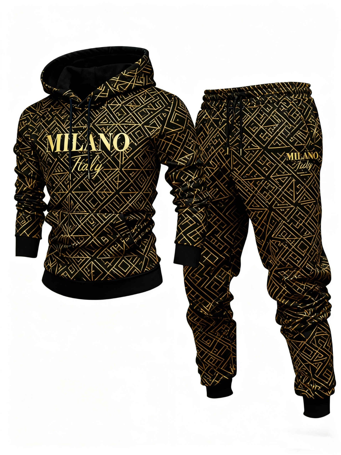 Men's Casual Black & Gold Color Geometric Printed Hoodies Long-Sleeve Sweatshirts & Sweatpants Two-Piece Set